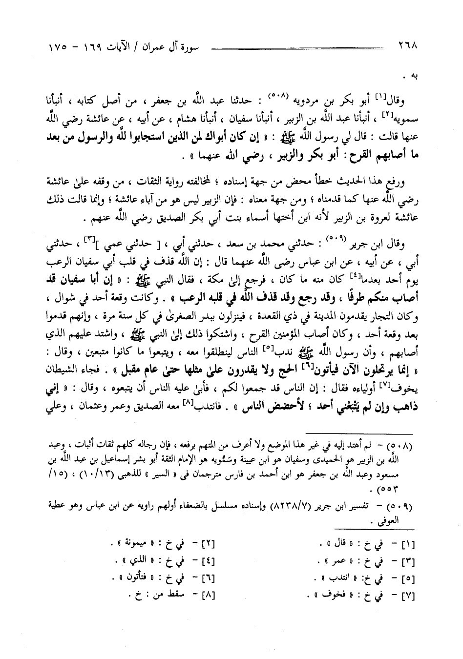 بِهِ وَقَدْ رَوَاهُ الْحَاكِم أَيْضًا مِنْ حَدِيث إِسْمَاعِيل بْن أَبِي خَالِد عَنْ التَّيْمِيّ عَنْ عُرْوَة وَقَالَ : قَالَتْ لِي عَائِشَة إِنَّ أَبَاك مِنْ الَّذِينَ اِسْتَجَابُوا لِلَّهِ وَالرَّسُول مِنْ بَعْدِ مَا أَصَابَهُمْ الْقَرْح ثُمَّ قَالَ صَحِيح عَلَى شَرْط الشَّيْخَيْنِ وَلَمْ يُخَرِّجَاهُ - وَقَالَ أَبُو بَكْر بْن مَرْدُوَيه حَدَّثَنَا عَبْد اللَّه بْن جَعْفَر مِنْ أَصْل كِتَابه أَنْبَأَنَا سَمُّويَة أَنْبَأَنَا عَبْد اللَّه بْن الزُّبَيْر أَنْبَأَنَا سُفْيَان أَنْبَأَنَا هِشَام عَنْ أَبِيهِ عَنْ عَائِشَة رَضِيَ اللَّه عَنْهُمَا قَالَتْ : قَالَ لِي رَسُول اللَّه صَلَّى اللَّه عَلَيْهِ وَسَلَّمَ " إِنْ كَانَ أَبَوَاك لَمِنْ الَّذِينَ اِسْتَجَابُوا لِلَّهِ وَالرَّسُول مِنْ بَعْدِ مَا أَصَابَهُمْ الْقَرْح أَبُو بَكْر وَالزُّبَيْر " وَرَفْعُ هَذَا الْحَدِيث خَطَأ مَحْض مِنْ جِهَة إِسْنَاده لِمُخَالَفَتِهِ رِوَايَة الثِّقَات مِنْ وَقْفِهِ عَلَى عَائِشَة رَضِيَ اللَّه عَنْهَا كَمَا قَدَّمْنَاهُ وَمِنْ جِهَة مَعْنَاهُ فَإِنَّ الزُّبَيْر لَيْسَ هُوَ مِنْ آبَاء عَائِشَة وَإِنَّمَا قَالَتْ ذَلِكَ عَائِشَة لِعُرْوَةَ بْن الزُّبَيْر لِأَنَّهُ اِبْن أُخْتهَا أَسْمَاء بِنْت أَبِي بَكْر الصِّدِّيق رَضِيَ اللَّه عَنْهُمْ - وَقَالَ اِبْن جَرِير : حَدَّثَنِي مُحَمَّد بْن سَعْد حَدَّثَنِي عَمِّي حَدَّثَنِي أَبِي عَنْ أَبِيهِ عَنْ اِبْن عَبَّاس قَالَ : إِنَّ اللَّه قَذَفَ فِي قَلْب أَبِي سُفْيَان الرُّعْب يَوْم أُحُد بَعْدَمَا كَانَ مِنْهُ مَا كَانَ فَرَجَعَ إِلَى مَكَّة فَقَالَ النَّبِيّ صَلَّى اللَّه عَلَيْهِ وَسَلَّمَ " إِنَّ أَبَا سُفْيَان قَدْ أَصَابَ مِنْكُمْ طَرَفًا وَقَدْ رَجَعَ وَقَدْ قَذَفَ اللَّه فِي قَلْبه الرُّعْب " وَكَانَتْ وَقْعَة أُحُد فِي شَوَّال وَكَانَ التُّجَّار يَقْدَمُونَ الْمَدِينَة فِي ذِي الْقَعْدَة فَيَنْزِلُونَ بِبَدْرٍ الصُّغْرَى فِي كُلّ سَنَة مَرَّة وَإِنَّهُمْ قَدِمُوا بَعْد وَقْعَة أُحُد وَكَانَ أَصَابَ الْمُؤْمِنِينَ الْقَرْح وَاشْتَكَوْا ذَلِكَ إِلَى النَّبِيّ صَلَّى اللَّه عَلَيْهِ وَسَلَّمَ وَاشْتَدَّ عَلَيْهِمْ الَّذِي أَصَابَهُمْ وَأَنَّ رَسُول اللَّه صَلَّى اللَّه عَلَيْهِ وَسَلَّمَ نَدَبَ النَّاس لِيَنْطَلِقُوا مَعَهُ وَيَتَّبِعُوا مَا كَانُوا مُتَّبِعِينَ وَقَالَ " إِنَّمَا يَرْتَحِلُونَ الْآن فَيَأْتُونَ الْحَجّ وَلَا يَقْدِرُونَ
