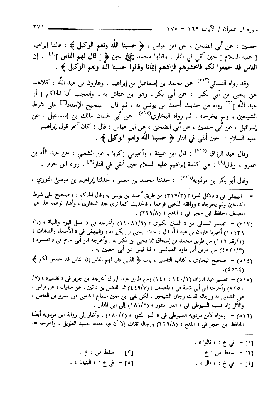 حُصَيْن عَنْ أَبِي الضُّحَى عَنْ اِبْن عَبَّاس " حَسْبُنَا اللَّه وَنِعْمَ الْوَكِيل " قَالَهَا إِبْرَاهِيم عَلَيْهِ السَّلَام حِين أُلْقِيَ فِي النَّار وَقَالَهَا مُحَمَّد صَلَّى اللَّه عَلَيْهِ وَسَلَّمَ حِين قَالَ لَهُمْ النَّاس إِنَّ النَّاس قَدْ جَمَعُوا لَكُمْ فَاخْشَوْهُمْ فَزَادَهُمْ إِيمَانًا وَقَالُوا حَسْبُنَا اللَّه وَنِعْمَ الْوَكِيل.