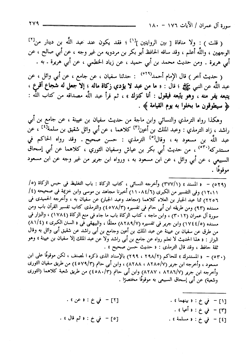" حَدِيث آخَر " قَالَ الْإِمَام أَحْمَد : حَدَّثَنَا سُفْيَان عَنْ جَامِع عَنْ أَبِي وَائِل عَنْ عَبْد اللَّه عَنْ النَّبِيّ صَلَّى اللَّه عَلَيْهِ وَسَلَّمَ قَالَ " مَا مِنْ عَبْد لَا يُؤَدِّي زَكَاة مَاله إِلَّا جُعِلَ لَهُ شُجَاع أَقْرَع يَتْبَعهُ يَفِرّ مِنْهُ فَيَتْبَعهُ فَيَقُول أَنَا كَنْزك " ثُمَّ قَرَأَ عَبْد اللَّه مِصْدَاقه مِنْ كِتَاب اللَّه " سَيُطَوَّقُونَ مَا بَخِلُوا بِهِ يَوْم الْقِيَامَة " .