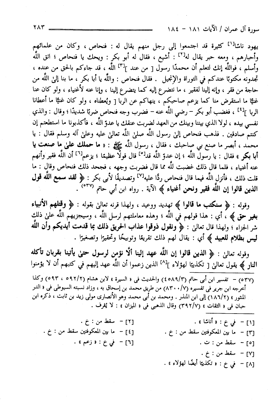 فَقَالَ فِنْحَاص : وَاَللَّه يَا أَبَا بَكْر مَا بِنَا إِلَى اللَّه مِنْ حَاجَة مِنْ فَقْر وَإِنَّهُ إِلَيْنَا لَفَقِير مَا نَتَضَرَّع إِلَيْهِ كَمَا يَتَضَرَّع إِلَيْنَا وَإِنَّا عَنْهُ لَأَغْنِيَاء وَلَوْ كَانَ عَنَّا غَنِيًّا مَا اِسْتَقْرَضَ مِنَّا كَمَا يَزْعُم صَاحِبكُمْ يَنْهَاكُمْ عَنْ الرَّبَّا وَيُعْطِينَا وَلَوْ كَانَ غَنِيًّا مَا أَعْطَاك الرِّبَا فَغَضِبَ أَبُو بَكْر رَضِيَ اللَّه عَنْهُ فَضَرَبَ وَجْه فِنْحَاص ضَرْبًا شَدِيدًا وَقَالَ : وَاَلَّذِي نَفْسِي بِيَدِهِ لَوْلَا الَّذِي بَيْننَا وَبَيْنك مِنْ الْعَهْد لَضَرَبْت عُنُقك يَا عَدُوّ اللَّه فَأَكْذِبُونَا مَا اِسْتَطَعْتُمْ إِنْ كُنْتُمْ صَادِقِينَ .