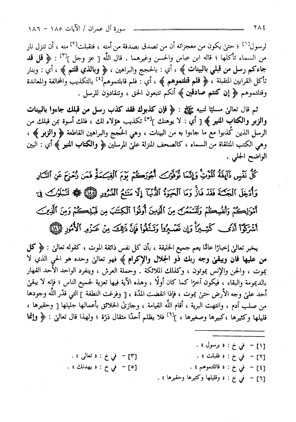 فَإِنْ كَذَّبُوكَ فَقَدْ كُذِّبَ رُسُلٌ مِنْ قَبْلِكَ جَاءُوا بِالْبَيِّنَاتِ وَالزُّبُرِ وَالْكِتَابِ الْمُنِيرِ (184)
