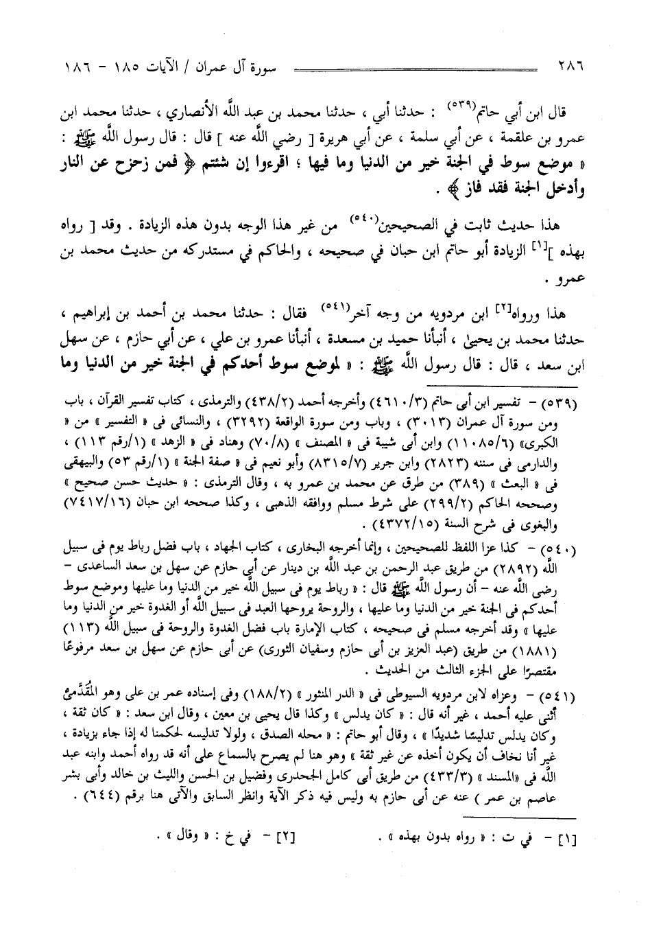 قَالَ اِبْن أَبِي حَاتِم حَدَّثَنَا أَبِي حَدَّثَنَا مُحَمَّد بْن عَبْد اللَّه الْأَنْصَارِيّ حَدَّثَنَا مُحَمَّد بْن عَمْرو بْن عَلْقَمَة عَنْ أَبِي سَلَمَة عَنْ أَبِي هُرَيْرَة قَالَ : قَالَ رَسُول اللَّه صَلَّى اللَّه عَلَيْهِ وَسَلَّمَ " مَوْضِع سَوْط فِي الْجَنَّة خَيْر مِنْ الدُّنْيَا وَمَا فِيهَا اِقْرَءُوا إِنْ شُئِمَ " فَمَنْ زُحْزِحَ عَنْ النَّار وَأُدْخِلَ الْجَنَّة فَقَدْ فَازَ " هَذَا حَدِيث ثَابِت فِي الصَّحِيحَيْنِ مِنْ غَيْر هَذَا الْوَجْه بِدُونِ هَذِهِ الزِّيَادَة .