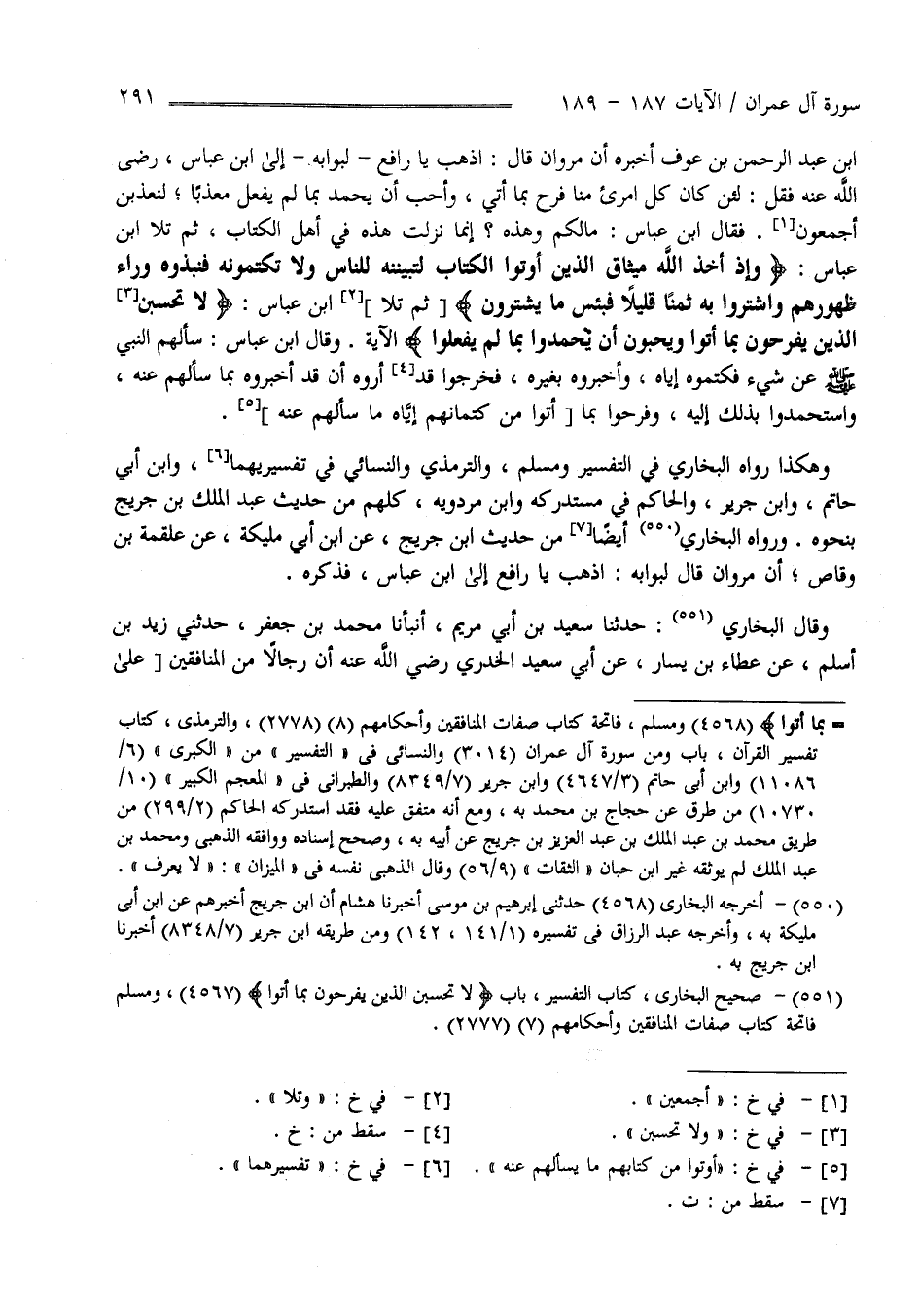 بْن عَبْد الرَّحْمَن بْن عَوْف أَخْبَرَهُ أَنَّ مَرْوَان قَالَ لِبَوَّابِهِ : اِذْهَبْ يَا رَافِع إِلَى اِبْن عَبَّاس فَقُلْ : لَئِنْ كَانَ كُلّ اِمْرِئٍ مِنَّا فَرِحَ بِمَا أَتَى وَأَحَبَّ أَنْ يُحْمَد بِمَا لَمْ يَفْعَل مُعَذَّبًا لَنُعَذَّبَنَّ أَجْمَعِينَ فَقَالَ اِبْن عَبَّاس مَا لَكُمْ وَهَذِهِ إِنَّمَا نَزَلَتْ هَذِهِ فِي أَهْل الْكِتَاب ثُمَّ تَلَا اِبْن عَبَّاس " وَإِذْ أَخَذَ اللَّه مِيثَاق الَّذِينَ أُوتُوا الْكِتَاب لَتُبَيِّنُنَّهُ لِلنَّاسِ وَلَا تَكْتُمُونَهُ فَنَبَذُوهُ وَرَاء ظُهُورهمْ وَاشْتَرَوْا بِهِ ثَمَنًا قَلِيلًا فَبِئْسَ مَا يَشْتَرُونَ لَا تَحْسَبَنَّ الَّذِينَ يَفْرَحُونَ بِمَا أَتَوْا وَيُحِبُّونَ أَنْ يُحْمَدُوا بِمَا لَمْ يَفْعَلُوا " الْآيَة .