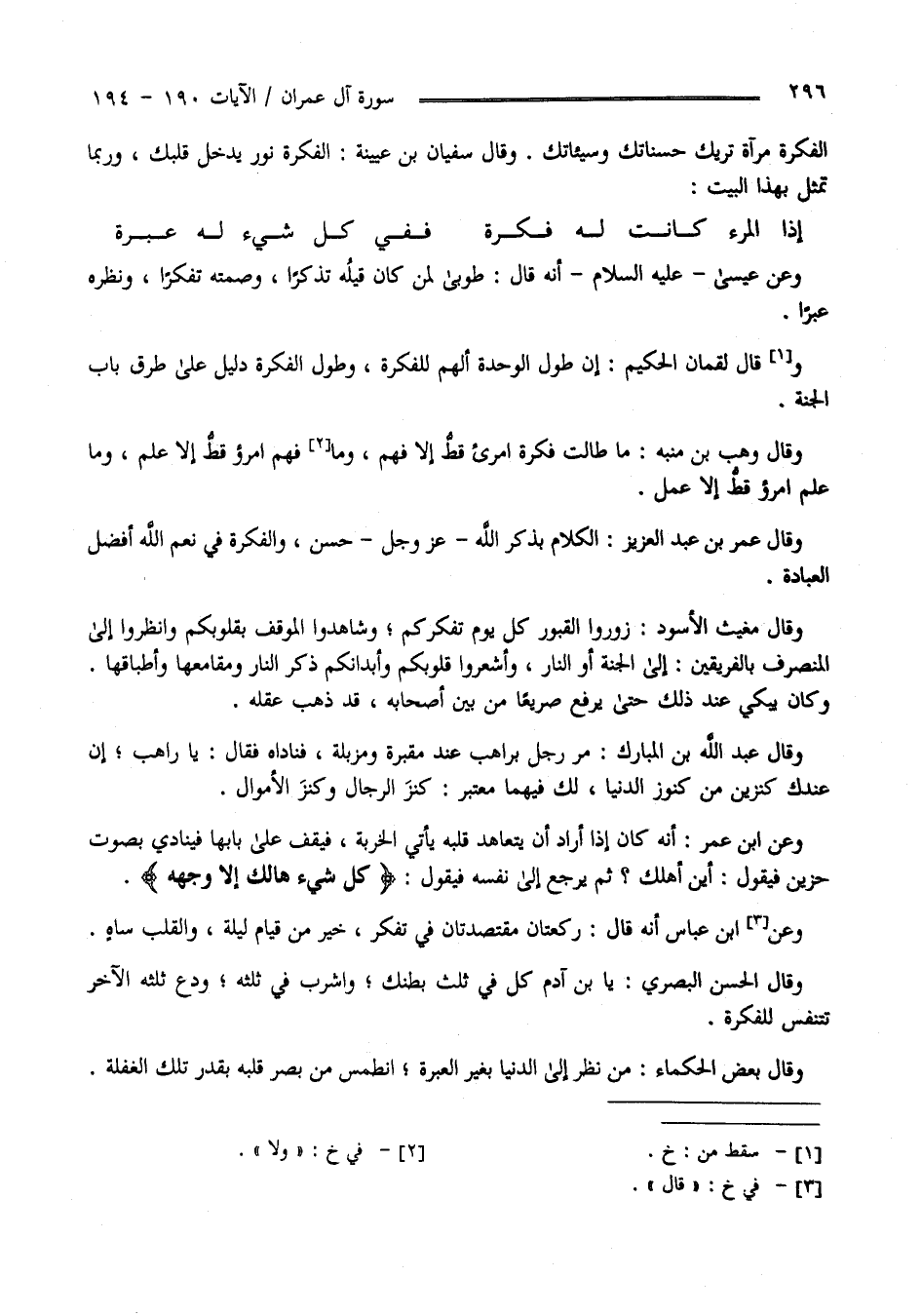 وَقَالَ سُفْيَان بْن عُيَيْنَةَ : الْفِكْر نُور يَدْخُل قَلْبك وَرُبَّمَا تَمَثَّلَ بِهَذَا الْبَيْت :