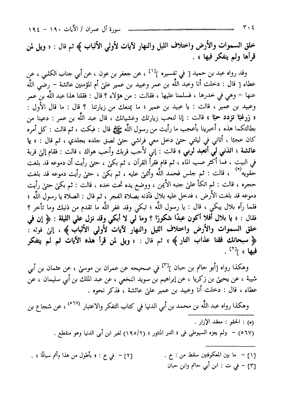 خَلْق السَّمَوَات وَالْأَرْض وَاخْتِلَاف اللَّيْل وَالنَّهَار لَآيَاتٍ لِأُولِي الْأَلْبَاب " ثُمَّ قَالَ " وَيْل لِمَنْ قَرَأَهَا وَلَمْ يَتَفَكَّر فِيهَا " وَقَدْ رَوَاهُ عَبْد بْن حُمَيْد فِي تَفْسِيره عَنْ جَعْفَر بْن عَوْف الْكَلْبِيّ عَنْ أَبِي حَبَّاب عَنْ عَطَاء قَالَ : دَخَلْت أَنَا وَعَبْد اللَّه بْن عُمَر وَعُبَيْد بْن عُمَيْر عَلَى أُمّ الْمُؤْمِنِينَ عَائِشَة رَضِيَ اللَّه عَنْهَا وَهِيَ فِي خِدْرهَا فَسَلَّمْنَا عَلَيْهَا فَقَالَتْ : مَنْ هَؤُلَاءِ ؟ قَالَ : فَقُلْنَا هَذَا عَبْد اللَّه بْن عُمَر وَعُبَيْد بْن عُمَيْر قَالَتْ : يَا عُبَيْد بْن عُمَيْر مَا يَمْنَعك مِنْ زِيَارَتنَا ؟ قَالَ : مَا قَالَ الْأَوَّل :