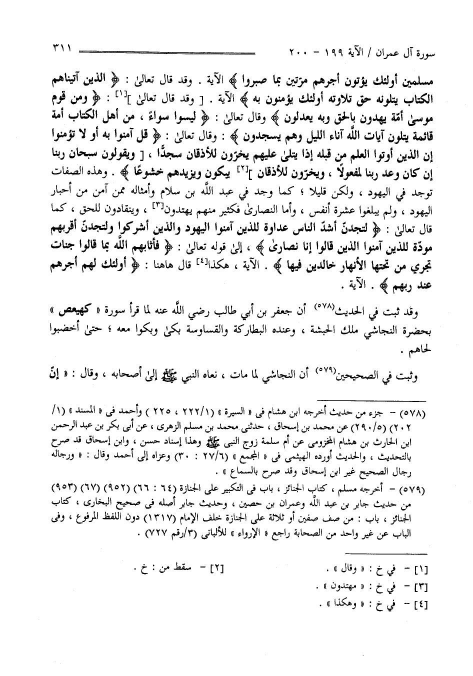 وَثَبَتَ فِي الصَّحِيحَيْنِ أَنَّ النَّجَاشِيّ لَمَّا مَاتَ نَعَاهُ النَّبِيّ صَلَّى اللَّه عَلَيْهِ وَسَلَّمَ إِلَى أَصْحَابه وَقَالَ " إِنَّ