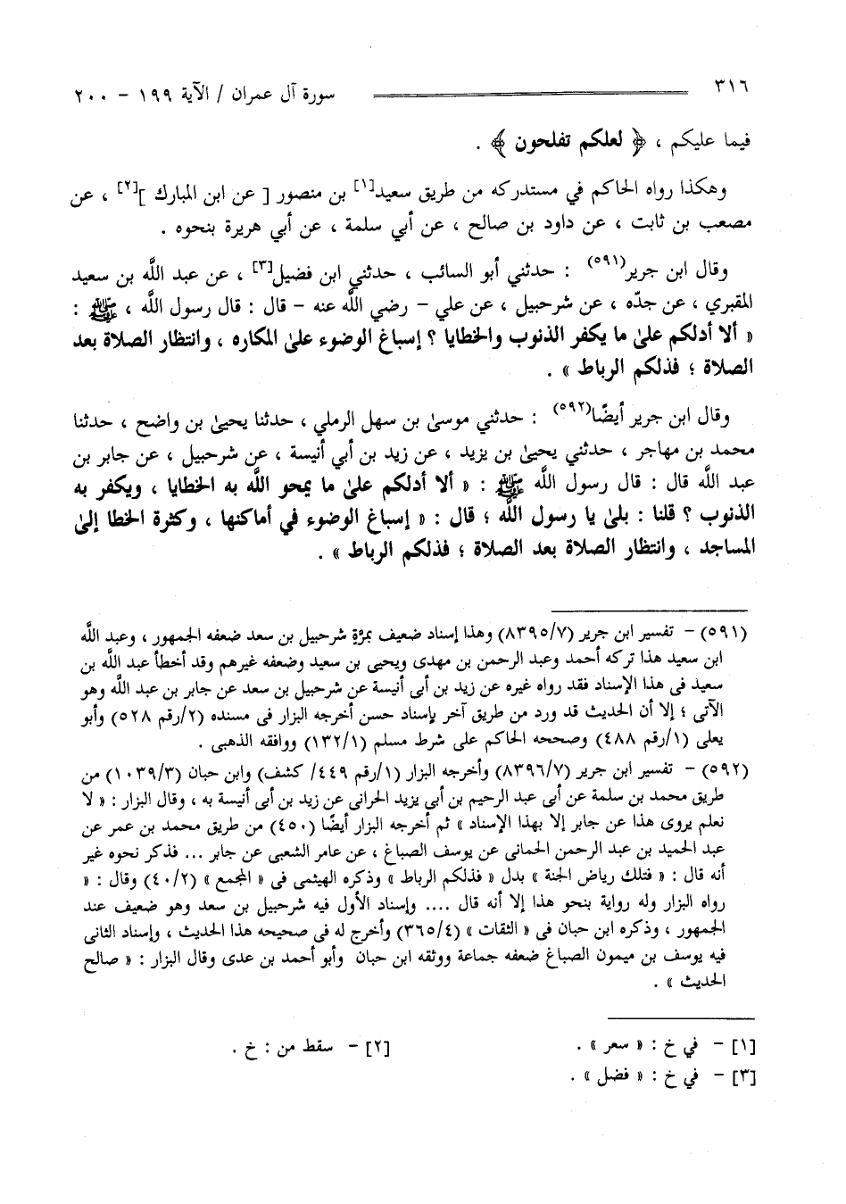 وَهَكَذَا رَوَاهُ الْحَاكِم فِي مُسْتَدْرَكه مِنْ طَرِيق سَعِيد بْن مَنْصُور عَنْ مَصْعَب بْن ثَابِت عَنْ دَاوُدَ بْن صَالِح عَنْ أَبِي سَلَمَة عَنْ أَبِي هُرَيْرَة بِنَحْوِهِ وَقَالَ اِبْن جَرِير حَدَّثَنِي أَبُو السَّائِب حَدَّثَنِي اِبْن فُضَيْل عَنْ عَبْد اللَّه بْن سَعِيد الْمَقْبُرِيّ عَنْ جَدّه عَنْ شُرَحْبِيل عَنْ عَلِيّ رَضِيَ اللَّه عَنْهُ قَالَ : قَالَ رَسُول اللَّه صَلَّى اللَّه عَلَيْهِ وَسَلَّمَ " أَلَا أَدُلّكُمْ عَلَى مَا يُكَفِّر الذُّنُوب وَالْخَطَايَا ؟ إِسْبَاغ الْوُضُوء عَلَى الْمَكَارِه وَانْتِظَار الصَّلَاة بَعْد الصَّلَاة فَذَلِكُمْ الرِّبَاط " وَقَالَ اِبْن جَرِير أَيْضًا حَدَّثَنِي مُوسَى بْن سَهْل الرَّمْلِيّ حَدَّثَنَا يَحْيَى بْن وَاضِح حَدَّثَنَا مُحَمَّد بْن مُهَاجِر حَدَّثَنِي يَحْيَى بْن زَيْد عَنْ زَيْد بْن أَبِي أُنَيْسَة عَنْ شُرَحْبِيل عَنْ جَابِر بْن عَبْد اللَّه قَالَ : قَالَ رَسُول اللَّه صَلَّى اللَّه عَلَيْهِ وَسَلَّمَ " أَلَا أَدُلّكُمْ عَلَى مَا يَمْحُو اللَّه بِهِ الْخَطَايَا وَيُكَفِّر بِهِ الذُّنُوب ؟ قُلْنَا بَلَى يَا رَسُول اللَّه قَالَ " إِسْبَاغ الْوُضُوء فِي أَمَاكِنهَا وَكَثْرَة الْخُطَى إِلَى الْمَسَاجِد وَانْتِظَار الصَّلَاة بَعْد الصَّلَاة فَذَلِكُمْ الرِّبَاط "