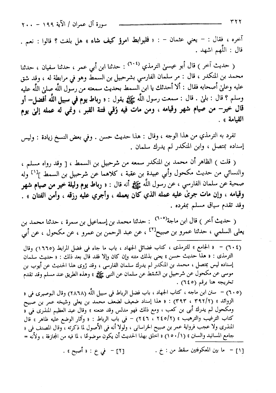 تَفَرَّدَ بِهِ التِّرْمِذِيّ مِنْ هَذَا الْوَجْه وَقَالَ هَذَا حَدِيث حَسَن وَفِي بَعْض النُّسَخ زِيَادَة وَلَيْسَ إِسْنَاده بِمُتَّصِلٍ : وَابْن الْمُنْكَدِر لَمْ يُدْرِك سَلْمَان " قُلْت " الظَّاهِر أَنَّ مُحَمَّد بْن الْمُنْكَدِر سَمِعَهُ مِنْ شُرَحْبِيل بْن السِّمْط وَقَدْ رَوَاهُ مُسْلِم وَالنَّسَائِيّ مِنْ حَدِيث مَكْحُول وَأَبِي عُبَيْدَة بْن عُقْبَة كِلَاهُمَا عَنْ شُرَحْبِيل بْن السِّمْط وَلَهُ صُحْبَة عَنْ سَلْمَان الْفَارِسِيّ عَنْ رَسُول اللَّه صَلَّى اللَّه عَلَيْهِ وَسَلَّمَ أَنَّهُ قَالَ " رِبَاط يَوْم وَلَيْلَة خَيْر مِنْ صِيَام شَهْر وَقِيَامه وَإِنْ مَاتَ جَرَى عَلَيْهِ الَّذِي كَانَ يَعْمَلهُ وَأُجْرِيَ عَلَيْهِ رِزْقه وَأَمِنَ الْفَتَّان " .