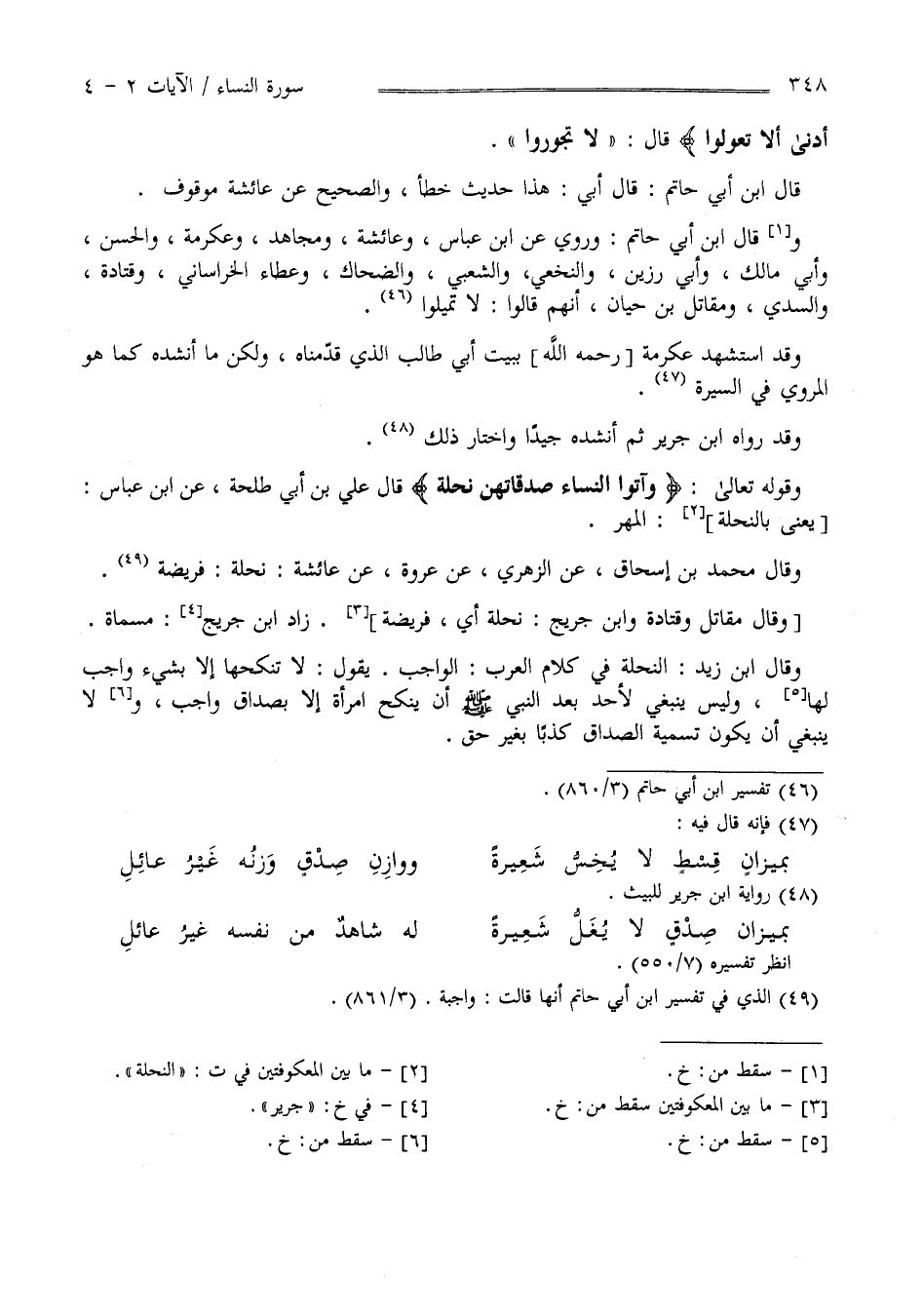 أَدْنَى أَلَّا تَعُولُوا " قَالَ " لَا تَجُورُوا " قَالَ اِبْن أَبِي حَاتِم قَالَ أَبِي هَذَا خَطَأ وَالصَّحِيح عَنْ عَائِشَة مَوْقُوف قَالَ اِبْن أَبِي حَاتِم وَرَوَى عَنْ اِبْن عَبَّاس وَعَائِشَة وَمُجَاهِد وَعِكْرِمَة وَالْحَسَن وَأَبِي مَالك وَابْن رَزِين وَالنَّخَعِيّ وَالشَّعْبِيّ وَالضَّحَّاك وَعَطَاء الْخُرَاسَانِيّ وَقَتَادَة وَالسُّدِّيّ وَمُقَاتِل بْن حَيَّان أَنَّهُمْ قَالُوا لَا تَمِيلُوا وَقَدْ اِسْتَشْهَدَ عِكْرِمَة بِبَيْتِ أَبِي طَالِب الَّذِي قَدَّمْنَاهُ وَلَكِنْ مَا أَنْشَدَهُ كَمَا هُوَ الْمَرْوِيّ فِي السِّيرَة وَقَدْ رَوَاهُ اِبْن جَرِير ثُمَّ أَنْشَدَهُ جَيِّدًا وَاخْتَارَ ذَلِكَ .