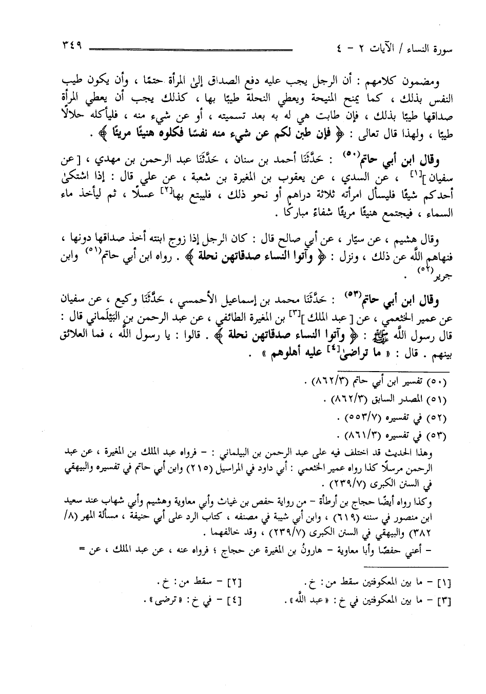 وَمَضْمُون كَلَامهمْ أَنَّ الرَّجُل يَجِب عَلَيْهِ دَفْع الصَّدَاق إِلَى الْمَرْأَة حَتْمًا وَأَنْ يَكُون طَيِّب النَّفْس بِذَلِكَ كَمَا يَمْنَح الْمَنِيحَة وَيُعْطِي النِّحْلَة طَيِّبًا كَذَلِكَ يَجِب أَنْ يُعْطِي الْمَرْأَة صَدَاقهَا طَيِّبًا بِذَلِكَ فَإِنْ طَابَتْ هِيَ لَهُ بِهِ بَعْد تَسْمِيَته أَوْ عَنْ شَيْء مِنْهُ فَلْيَأْكُلْهُ حَلَالًا طَيِّبًا وَلِهَذَا قَالَ " فَإِنْ طِبْنَ لَكُمْ عَنْ شَيْء مِنْهُ نَفْسًا فَكُلُوهُ هَنِيئًا مَرِيئًا " وَقَالَ اِبْن أَبِي حَاتِم حَدَّثَنَا أَحْمَد بْن سِنَان حَدَّثَنَا عَبْد الرَّحْمَن بْن مَهْدِيّ عَنْ سُفْيَان عَنْ السُّدِّيّ عَنْ يَعْقُوب بْن الْمُغِيرَة بْن شُعْبَة عَنْ عَلِيّ قَالَ : إِذَا اِشْتَكَى أَحَدكُمْ شَيْئًا فَلْيَسْأَلْ اِمْرَأَته ثَلَاثَة دَرَاهِم أَوْ نَحْو ذَلِكَ فَلْيَبْتَعْ بِهَا عَسَلًا ثُمَّ لِيَأْخُذ مَاء السَّمَاء فَيَجْتَمِع هَنِيئًا مَرِيئًا شِفَاء مُبَارَكًا .
