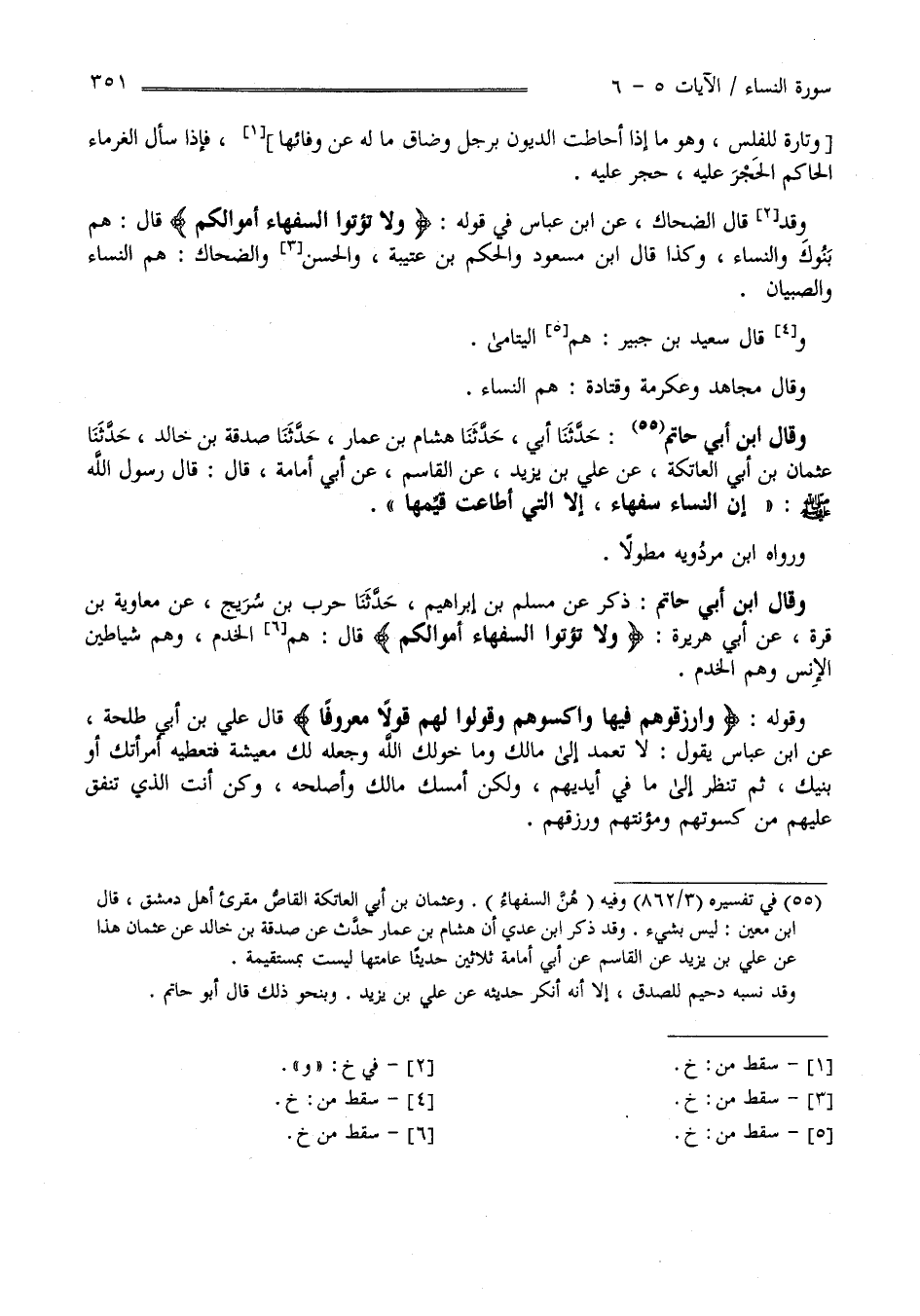 وَقَالَ اِبْن أَبِي حَاتِم ذُكِرَ عَنْ مُسْلِم بْن إِبْرَاهِيم حَدَّثَنَا حَرْب بْن شُرَيْح عَنْ مُعَاوِيَة بْن قُرَّة عَنْ أَبِي هُرَيْرَة " وَلَا تُؤْتُوا السُّفَهَاء أَمْوَالكُمْ " قَالَ هُمْ الْخَدَم وَهُمْ شَيَاطِين الْإِنْس وَقَوْله " وَارْزُقُوهُمْ فِيهَا وَاكْسُوهُمْ وَقُولُوا لَهُمْ قَوْلًا مَعْرُوفًا " قَالَ عَلِيّ بْن أَبِي طَلْحَة عَنْ اِبْن عَبَّاس يَقُول : لَا تَعْمِد إِلَى مَالك وَمَا خَوَّلَك اللَّه وَجَعَلَهُ لَك مَعِيشَة فَتُعْطِيه اِمْرَأَتك أَوْ بِنْتك ثُمَّ تَنْظُر إِلَى مَا فِي أَيْدِيهمْ وَلَكِنْ أَمْسِكْ مَالك وَأَصْلِحْهُ وَكُنْ أَنْتَ الَّذِي تُنْفِق عَلَيْهِمْ مِنْ كِسْوَتهمْ وَمُؤْنَتهمْ وَرِزْقهمْ.