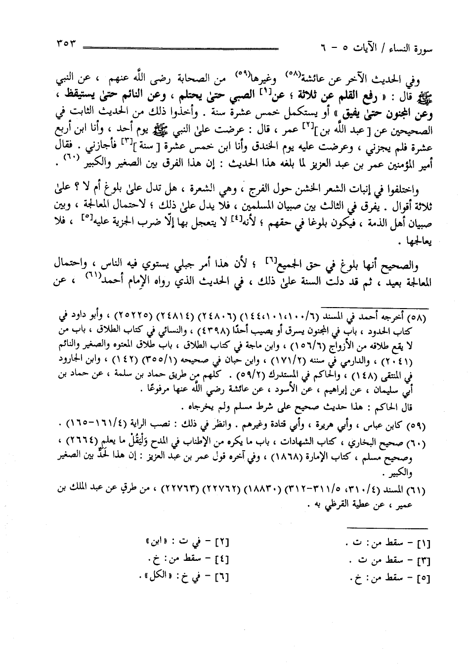 وَعَنْ النَّائِم حَتَّى يَسْتَيْقِظ وَعَنْ الْمَجْنُون حَتَّى يُفِيق " وَأَخَذُوا ذَلِكَ مِنْ الْحَدِيث الثَّابِت فِي الصَّحِيحَيْنِ عَنْ اِبْن عُمَر قَالَ : عُرِضْت عَلَى النَّبِيّ صَلَّى اللَّه عَلَيْهِ وَسَلَّمَ يَوْم أُحُد وَأَنَا اِبْن أَرْبَع عَشْرَة فَلَمْ يُجِزْنِي وَعُرِضْت عَلَيْهِ يَوْم الْخَنْدَق وَأَنَا اِبْن خَمْس عَشْرَة سَنَة فَأَجَازَنِي .