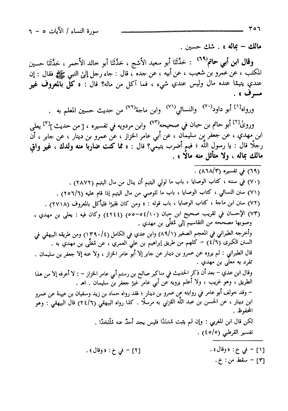 وَقَالَ اِبْن أَبِي حَاتِم : حَدَّثَنَا أَبُو سَعِيد الْأَشَجّ حَدَّثَنَا أَبُو خَالِد الْأَحْمَر حَدَّثَنَا حُسَيْن الْمُكْتِب عَنْ عَمْرو بْن شُعَيْب عَنْ أَبِيهِ عَنْ جَدّه قَالَ جَاءَ رَجُل إِلَى النَّبِيّ صَلَّى اللَّه عَلَيْهِ وَسَلَّمَ فَقَالَ : إِنَّ عِنْدِي يَتِيمًا عِنْده مَال وَلَيْسَ لِي مَال آكُل مِنْ مَاله ؟ قَالَ " كُلْ بِالْمَعْرُوفِ غَيْر مُسْرِف " .