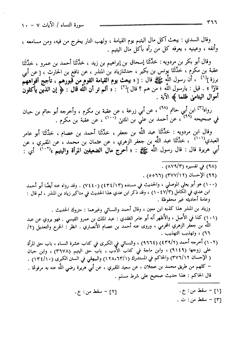 قَالَ اِبْن مَرْدَوَيْهِ : حَدَّثَنَا عَبْد اللَّه بْن جَعْفَر حَدَّثَنَا أَحْمَد بْن عِصَام حَدَّثَنَا أَبُو عَامِر الْعَبْدِيّ حَدَّثَنَا عَبْد اللَّه بْن جَعْفَر الزُّهْرِيّ عَنْ عُثْمَان بْن مُحَمَّد عَنْ الْمُقْرِي عَنْ أَبِي هُرَيْرَة قَالَ : قَالَ رَسُول اللَّه صَلَّى اللَّه عَلَيْهِ وَسَلَّمَ " أُحَرِّج مَال الضَّعِيفَيْنِ الْمَرْأَة وَالْيَتِيم " أَيْ