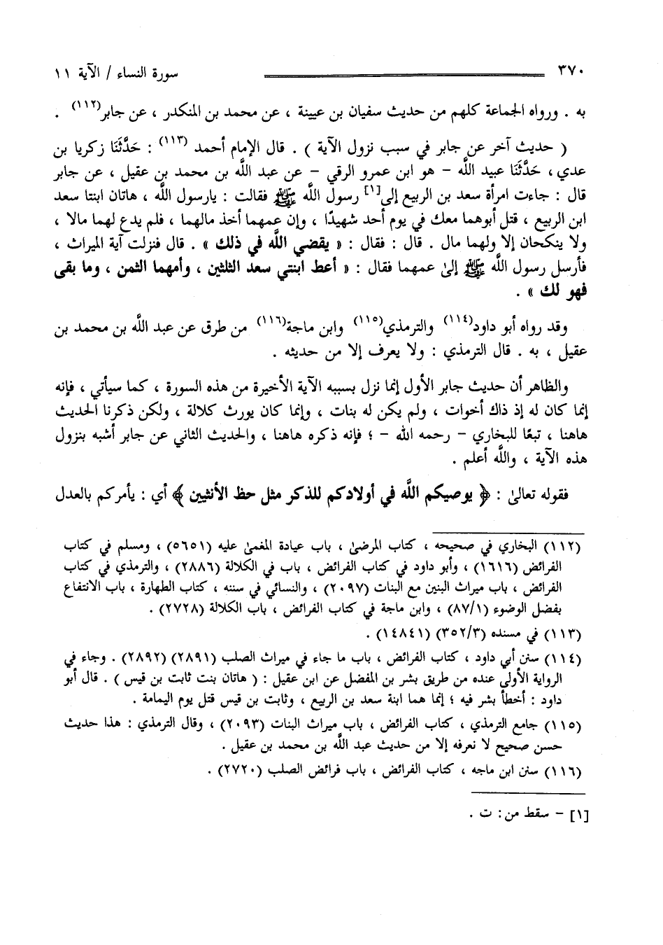 وَالظَّاهِر أَنَّ حَدِيث جَابِر الْأَوَّل إِنَّمَا نَزَلَ بِسَبَبِهِ الْآيَة الْأَخِيرَة مِنْ هَذِهِ السُّورَة كَمَا سَيَأْتِي فَإِنَّهُ إِنَّمَا كَانَ لَهُ إِذْ ذَاكَ أَخَوَات وَلَمْ يَكُنْ لَهُ بَنَات وَإِنَّمَا كَانَ يَرِث كَلَالَة وَلَكِنْ ذَكَرْنَا الْحَدِيث هَهُنَا تَبَعًا لِلْبُخَارِيِّ فَإِنَّهُ ذَكَرَهُ هَهُنَا وَالْحَدِيث الثَّانِي عَنْ جَابِر أَشْبَه بِنُزُولِ هَذِهِ الْآيَة وَاَللَّه أَعْلَم .