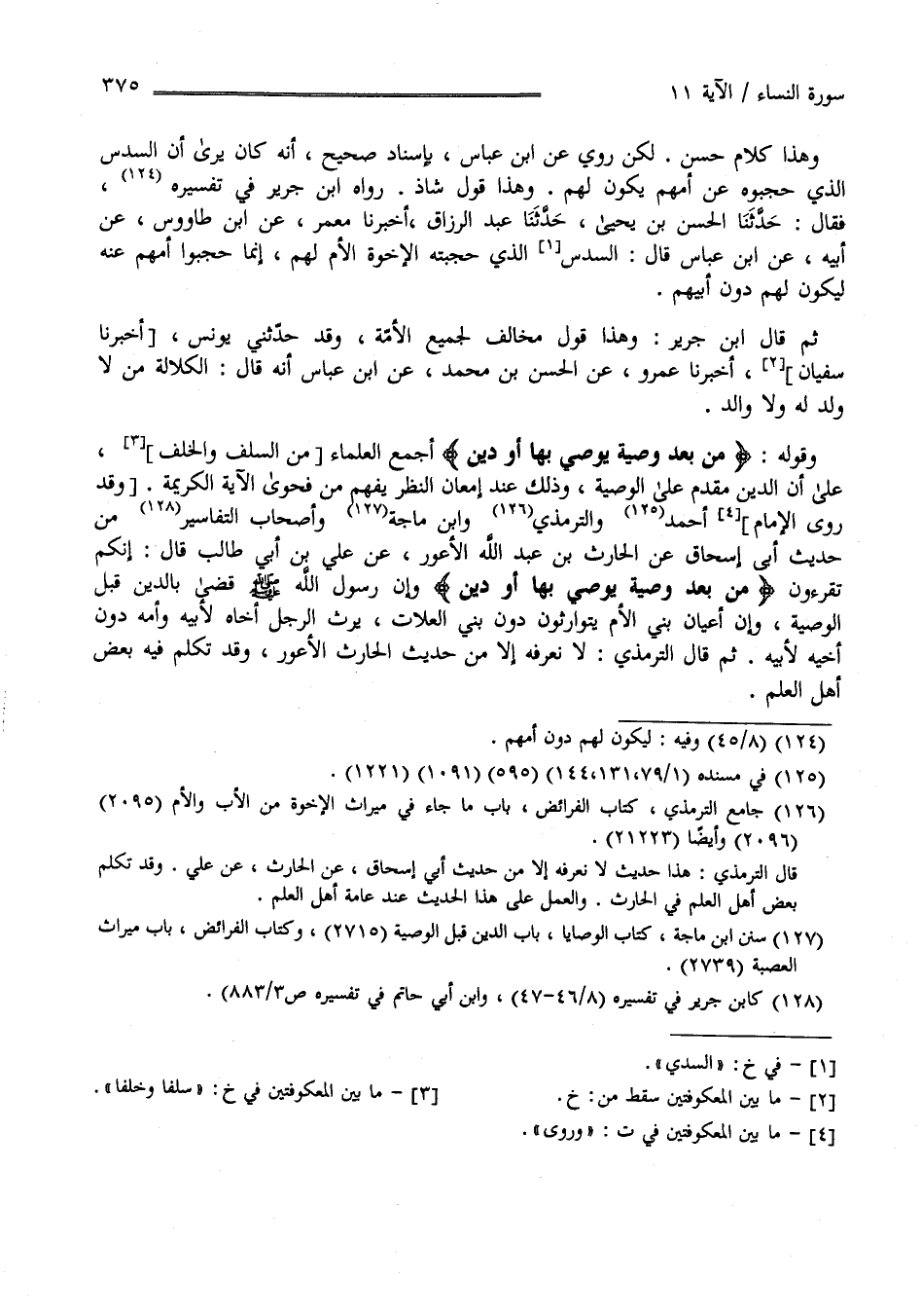 لَكِنْ رُوِيَ عَنْ اِبْن عَبَّاس بِإِسْنَادٍ صَحِيح أَنَّهُ كَانَ يَرَى أَنَّ السُّدُس الَّذِي حَجَبُوهُ عَنْ أُمّهمْ يَكُون لَهُمْ وَهَذَا قَوْل شَاذّ رَوَاهُ اِبْن جَرِير فِي تَفْسِيره فَقَالَ : حَدَّثَنَا الْحَسَن بْن يَحْيَى حَدَّثَنَا عَبْد الرَّزَّاق أَخْبَرَنَا مَعْمَر عَنْ أَبِي طَاوُس عَنْ أَبِيهِ عَنْ اِبْن عَبَّاس قَالَ : السُّدُس الَّذِي حَجَبَتْهُ الْإِخْوَة الْأُمّ لَهُمْ إِنَّمَا حَجَبُوا أُمّهمْ عَنْهُ لِيَكُونَ لَهُمْ دُون أَبِيهِمْ .