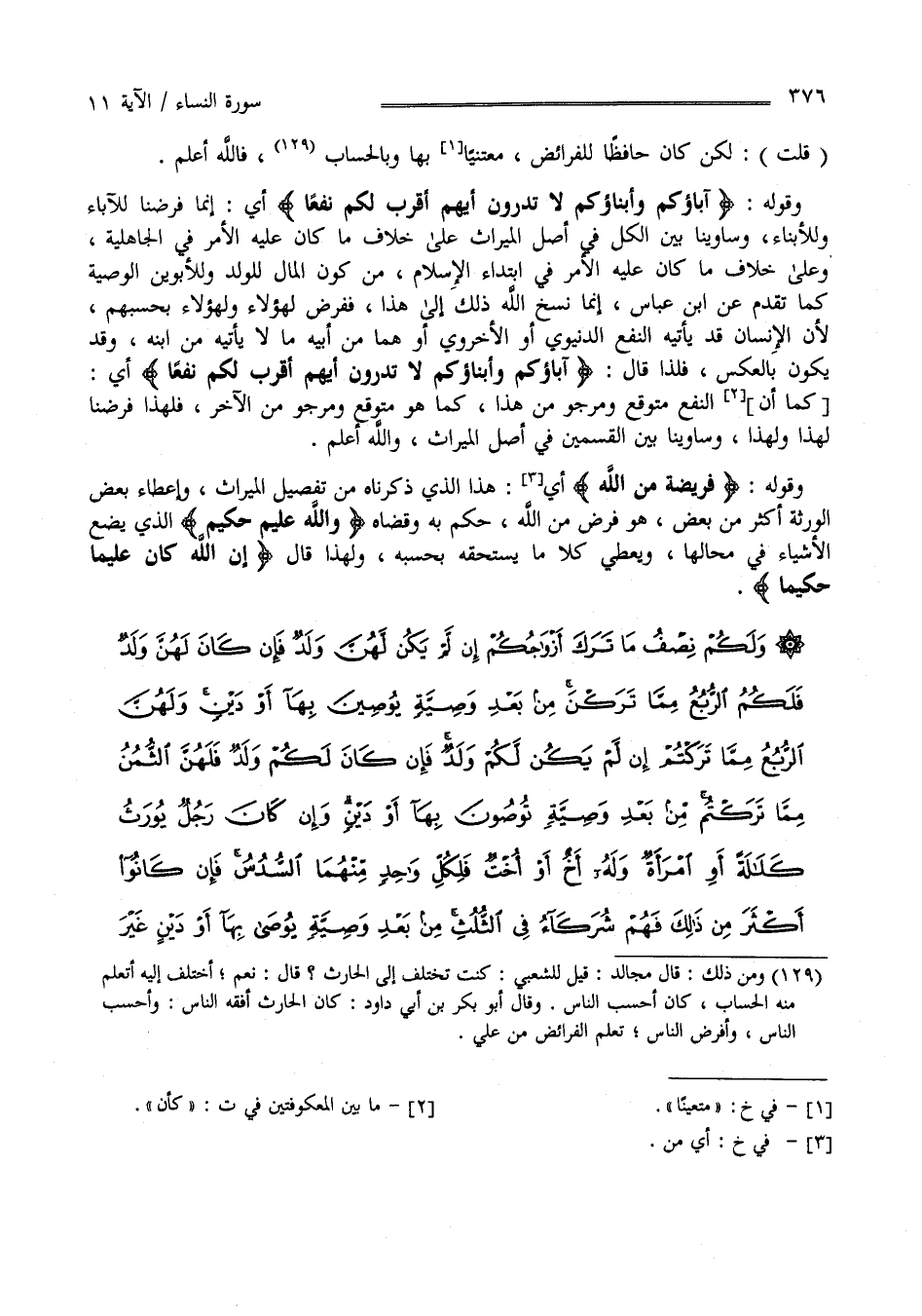 " قُلْت " لَكِنْ كَانَ حَافِظًا لِلْفَرَائِضِ مُعْتَنِيًا بِهَا وَبِالْحِسَابِ فَاَللَّه أَعْلَم وَقَوْله " آبَاؤُكُمْ وَأَبْنَاؤُكُمْ لَا تَدْرُونَ أَيّهمْ أَقْرَب لَكُمْ نَفْعًا " أَيْ إِنَّمَا فَرَضْنَا لِلْآبَاءِ وَالْأَبْنَاء وَسَاوَيْنَا بَيْن الْكُلّ فِي أَصْل الْمِيرَاث عَلَى خِلَاف مَا كَانَ عَلَيْهِ الْأَمْر فِي الْجَاهِلِيَّة وَعَلَى خِلَاف مَا كَانَ عَلَيْهِ الْأَمْر فِي اِبْتِدَاء الْإِسْلَام مِنْ كَوْن الْمَال لِلْوَلَدِ وَلِلْأَبَوَيْنِ الْوَصِيَّة كَمَا تَقَدَّمَ عَنْ اِبْن عَبَّاس إِنَّمَا نَسَخَ اللَّه ذَلِكَ إِلَى هَذَا فَفَرَضَ لِهَؤُلَاءِ بِحَسَبِهِمْ لِأَنَّ الْإِنْسَان قَدْ يَأْتِيه النَّفْع الدُّنْيَوِيّ أَوْ الْأُخْرَوِيّ أَوْ هُمَا مِنْ أَبِيهِ مَا لَا يَأْتِيه مِنْ اِبْنه وَقَدْ يَكُون بِالْعَكْسِ وَلِذَا قَالَ " آبَاؤُكُمْ وَأَبْنَاؤُكُمْ لَا تَدْرُونَ أَيّهمْ أَقْرَب لَكُمْ نَفْعًا " أَيْ أَنَّ النَّفْع مُتَوَقَّع وَمَرْجُوّ مِنْ هَذَا كَمَا هُوَ مُتَوَقَّع وَمَرْجُوّ مِنْ الْآخَر فَلِهَذَا فَرَضْنَا لِهَذَا وَهَذَا وَسَاوَيْنَا بَيْن الْقِسْمَيْنِ فِي أَصْل الْمِيرَاث وَاَللَّه أَعْلَم وَقَوْله " فَرِيضَة مِنْ اللَّه " أَيْ هَذَا الَّذِي ذَكَرْنَاهُ مِنْ تَفْصِيل الْمِيرَاث وَإِعْطَاء بَعْض الْوَرَثَة أَكْثَر مِنْ بَعْض هُوَ فَرْض مِنْ اللَّه حَكَمَ بِهِ وَقَضَاهُ وَاَللَّه عَلِيم حَكِيم الَّذِي يَضَع الْأَشْيَاء فِي مَجَالهَا وَمُعْطِي كُلًّا مَا يَسْتَحِقّهُ بِحَسَبِهِ وَلِهَذَا قَالَ " إِنَّ اللَّه كَانَ عَلِيمًا حَكِيمًا " .