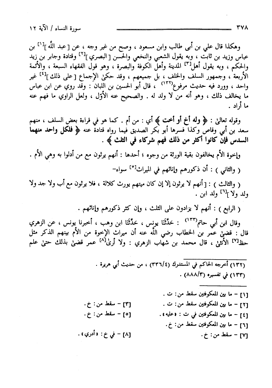وَقَوْله تَعَالَى " وَلَهُ أَخ أَوْ أُخْت " أَيْ مِنْ أُمّ كَمَا هُوَ فِي قِرَاءَة بَعْض السَّلَف مِنْهُمْ سَعْد بْن أَبِي وَقَّاص وَكَذَا فَسَّرَهَا أَبُو بَكْر الصِّدِّيق فِيمَا رَوَاهُ قَتَادَة عَنْهُ " فَلِكُلِّ وَاحِد مِنْهُمَا السُّدُس فَإِنْ كَانُوا أَكْثَر مِنْ ذَلِكَ فَهُمْ شُرَكَاء فِي الثُّلُث " وَإِخْوَة الْأُمّ يُخَالِفُونَ بَقِيَّة الْوَرَثَة مِنْ وُجُوه أَحَدهَا : أَنَّهُمْ يَرِثُونَ مَنْ أَدْلَوْا بِهِ وَهِيَ الْأُمّ " وَالثَّانِي " أَنَّ ذُكُورهمْ وَإِنَاثهمْ فِي الْمِيرَاث سَوَاء " وَالثَّالِث " لَا يَرِثُونَ إِلَّا إِنْ كَانَ مَيِّتهمْ يُورَث كَلَالَة فَلَا يَرِثُونَ مَعَ أَب وَلَا جَدّ وَلَا وَلَد وَلَا وَلَد اِبْن " الرَّابِع " أَنَّهُمْ لَا يُزَادُونَ عَلَى الثُّلُث وَإِنْ كَثُرَ ذُكُورهمْ وَإِنَاثهمْ - وَقَالَ اِبْن أَبِي حَاتِم حَدَّثَنَا يُونُس حَدَّثَنَا اِبْن وَهْب أَخْبَرَنَا يُونُس عَنْ الزُّهْرِيّ قَالَ : قَضَى عُمَر أَنَّ مِيرَاث الْإِخْوَة مِنْ الْأُمّ بَيْنهمْ لِلذَّكَرِ مِثْل حَظّ الْأُنْثَى قَالَ الزُّهْرِيّ : وَلَا أَرَى عُمَر قَضَى بِذَلِكَ حَتَّى عَلِمَ