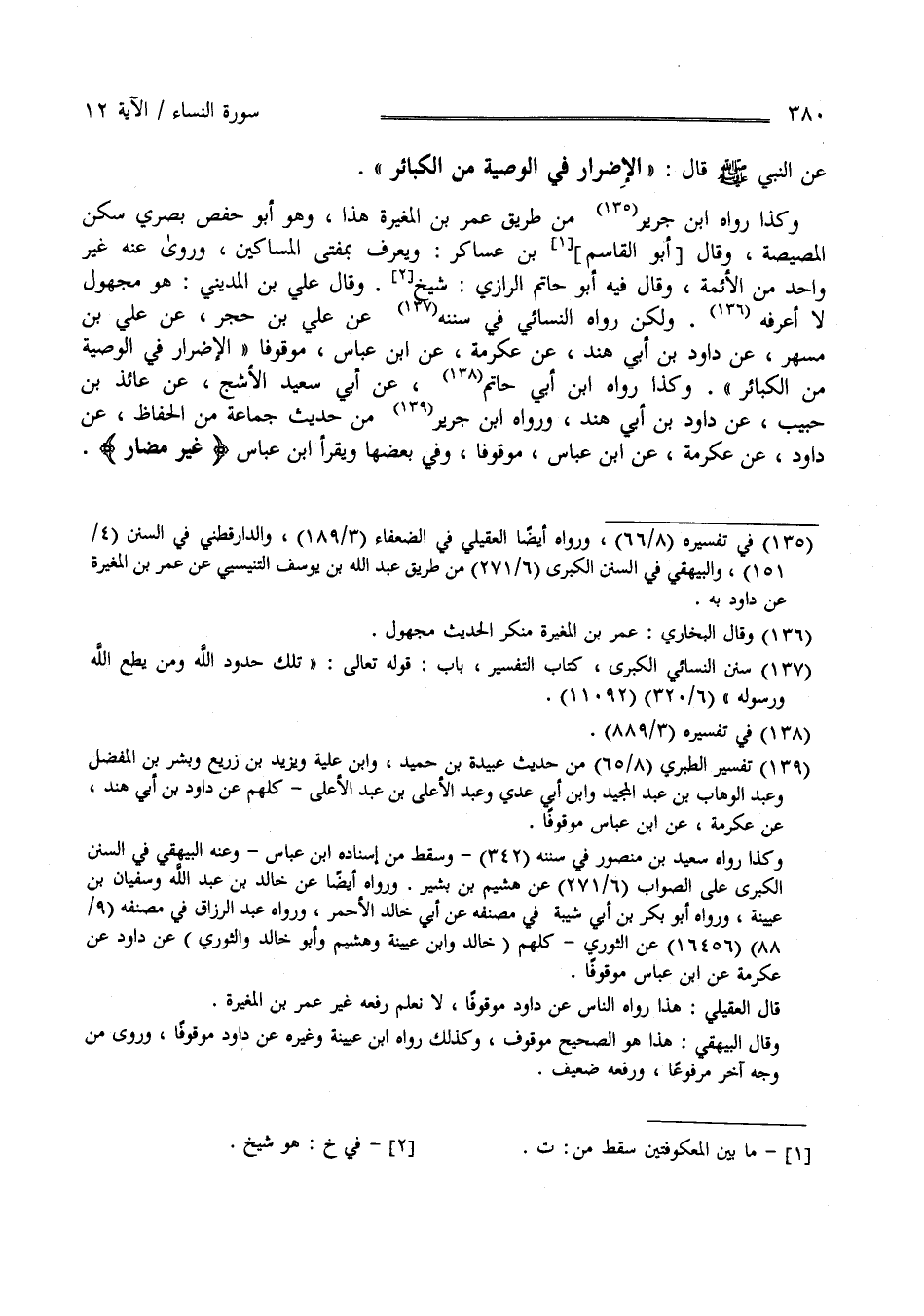 وَكَذَا رَوَاهُ اِبْن جَرِير مِنْ طَرِيق عُمَر بْن الْمُغِيرَة هَذَا وَهُوَ أَبُو حَفْص بَصْرِيّ سَكَنَ الْمِصِّيصَة قَالَ اِبْن عَسَاكِر : وَيُعْرَف بِمُغْنِي الْمَسَاكِين وَرَوَى عَنْهُ غَيْر وَاحِد مِنْ الْأَئِمَّة وَقَالَ فِيهِ أَبُو حَاتِم الرَّازِيّ : هُوَ شَيْخ وَقَالَ عَلِيّ بْن الْمَدِينِيّ : هُوَ مَجْهُول لَا أَعْرِفهُ لَكِنْ رَوَاهُ النَّسَائِيّ فِي سُنَنه عَنْ عَلِيّ بْن حُجْر عَنْ عَلِيّ بْن مُسْهِر عَنْ دَاوُد بْن أَبِي هِنْد عَنْ عِكْرِمَة عَنْ اِبْن عَبَّاس مَوْقُوفًا " الْإِضْرَار فِي الْوَصِيَّة مِنْ الْكَبَائِر " وَكَذَا رَوَاهُ اِبْن أَبِي حَاتِم عَنْ أَبِي سَعِيد الْأَشَجّ عَنْ عَائِذ بْن حَبِيب عَنْ دَاوُد بْن أَبِي هِنْد وَرَوَاهُ اِبْن جَرِير مِنْ حَدِيث جَمَاعَة مِنْ الْحُفَّاظ عَنْ دَاوُد عَنْ عِكْرِمَة عَنْ اِبْن عَبَّاس مَوْقُوفًا وَفِي بَعْضهَا وَيَقْرَأ اِبْن عَبَّاس " غَيْر مُضَارّ "
