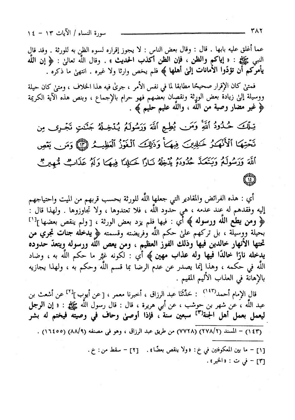 وَلِهَذَا قَالَ " وَمَنْ يُطِعْ اللَّه وَرَسُوله " أَيْ فِيهَا فَلَمْ يَزِدْ بَعْض الْوَرَثَة وَلَمْ يَنْقُص بَعْضهَا بِحِيلَةٍ وَوَسِيلَة بَلْ تَرَكَهُمْ عَلَى حُكْم اللَّه وَفَرِيضَته وَقِسْمَته " يُدْخِلهُ جَنَّات تَجْرِي مِنْ تَحْتهَا الْأَنْهَار خَالِدِينَ فِيهَا وَذَلِكَ الْفَوْز الْعَظِيم .