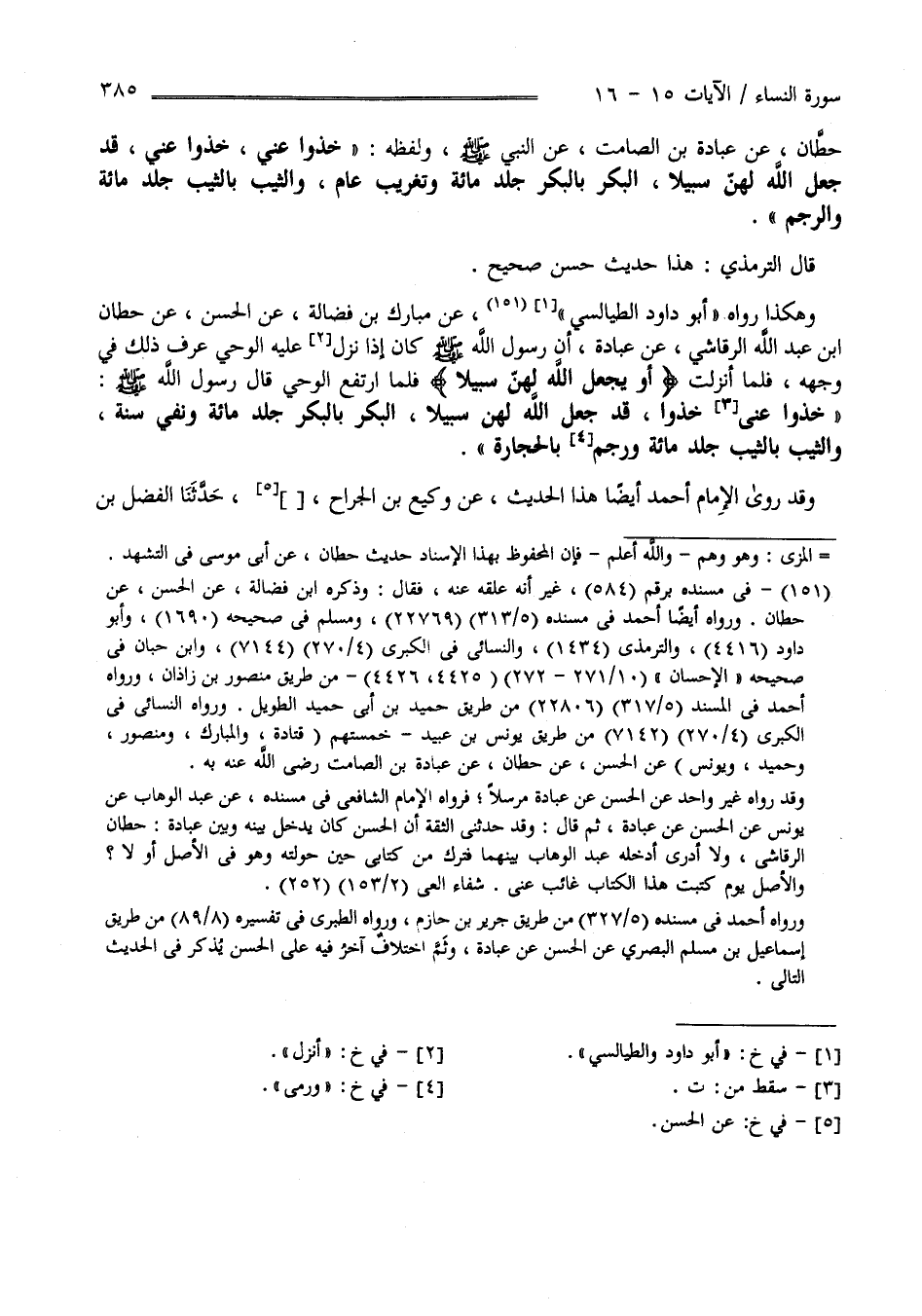 حِطَّان عَنْ عُبَادَة بْن الصَّامِت عَنْ النَّبِيّ صَلَّى اللَّه عَلَيْهِ وَسَلَّمَ وَلَفْظه " خُذُوا عَنِّي خُذُوا عَنِّي قَدْ جَعَلَ اللَّه لَهُنَّ سَبِيلًا الْبِكْر بِالْبِكْرِ جَلْد مِائَة وَتَغْرِيب عَام وَالثَّيِّب بِالثَّيِّبِ جَلْد مِائَة وَالرَّجْم " .
