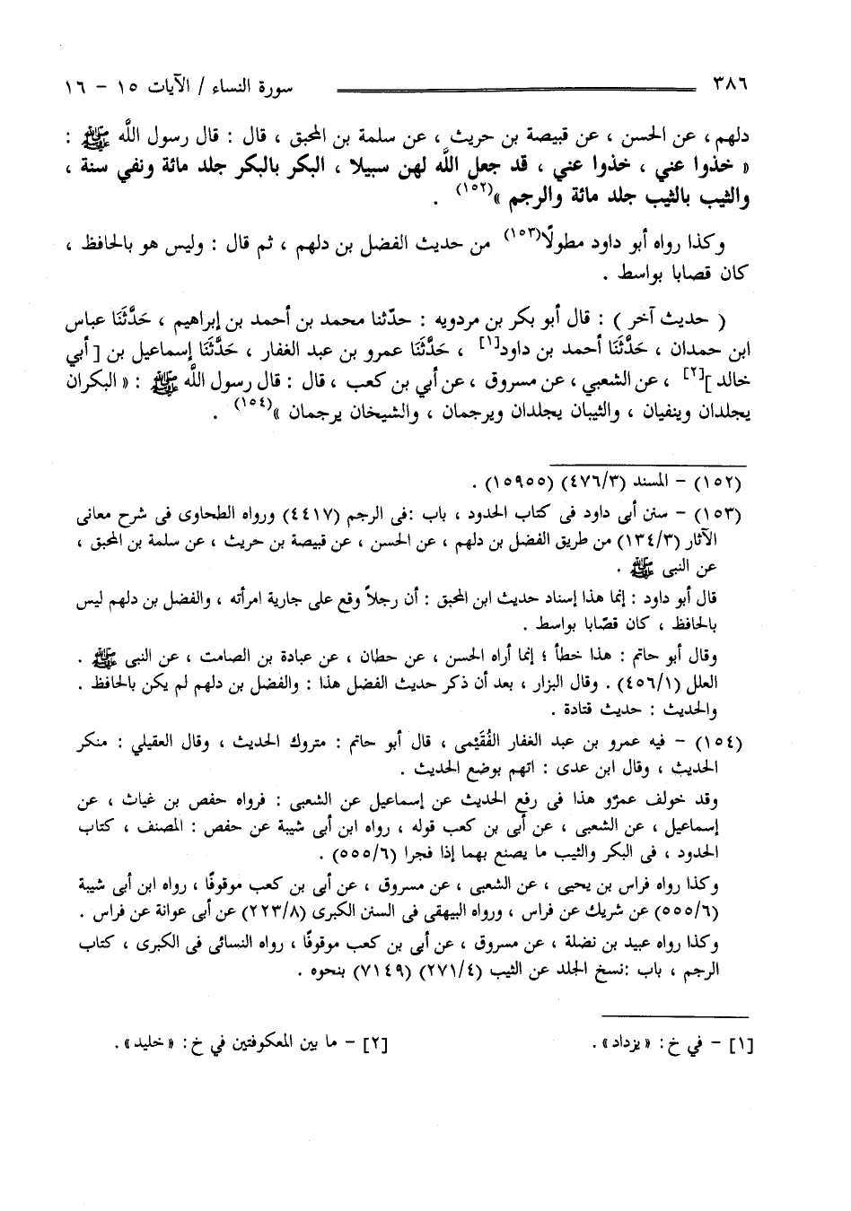 دَلْهَم عَنْ قُبَيْصَة بْن حَرْب عَنْ سَلَمَة بْن الْمُحَبَّق قَالَ : قَالَ رَسُول اللَّه صَلَّى اللَّه عَلَيْهِ وَسَلَّمَ " خُذُوا عَنِّي خُذُوا عَنِّي قَدْ جَعَلَ اللَّه لَهُنَّ سَبِيلًا الْبِكْر بِالْبِكْرِ جَلْد مِائَة وَنَفْي سَنَة وَالثَّيِّب بِالثَّيِّبِ جَلْد مِائَة وَالرَّجْم " وَكَذَا رَوَاهُ أَبُو دَاوُد مُطَوَّلًا مِنْ حَدِيث الْفَضْل بْن دَلْهَم ثُمَّ قَالَ : وَلَيْسَ هُوَ بِالْحَافِظِ كَانَ قَصَّابًا بِوَاسِط.
