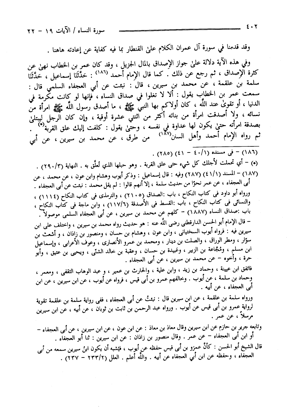 وَفِي هَذِهِ الْآيَة دَلَالَة عَلَى جَوَاز الْإِصْدَاق بِالْمَالِ الْجَزِيل وَقَدْ كَانَ عُمَر بْن الْخَطَّاب نَهَى عَنْ كَثْرَة الْإِصْدَاق ثُمَّ رَجَعَ عَنْ ذَلِكَ كَمَا قَالَ الْإِمَام أَحْمَد حَدَّثَنَا إِسْمَاعِيل حَدَّثَنَا سَلَمَة بْن عَلْقَمَة عَنْ مُحَمَّد بْن سِيرِينَ قَالَ : نُبِّئْت عَنْ أَبِي الْعَجْفَاء السُّلَمِيّ قَالَ : سَمِعْت عُمَر بْن الْخَطَّاب يَقُول : أَلَا لَا تُغَالُوا فِي صَدَاق النِّسَاء فَإِنَّهَا لَوْ كَانَتْ مَكْرُمَة فِي الدُّنْيَا أَوْ تَقْوَى عِنْد اللَّه كَانَ أَوْلَاكُمْ بِهَا النَّبِيّ صَلَّى اللَّه عَلَيْهِ وَسَلَّمَ مَا أَصْدَقَ رَسُول اللَّه صَلَّى اللَّه عَلَيْهِ وَسَلَّمَ اِمْرَأَة مِنْ نِسَائِهِ وَلَا أُصْدِقَتْ اِمْرَأَة مِنْ بَنَاته أَكْثَر مِنْ اِثْنَتَيْ عَشْرَة أُوقِيَّة وَإِنْ كَانَ الرَّجُل لَيُبْتَلَى بِصَدُقَةِ اِمْرَأَته حَتَّى يَكُون لَهَا عَدَاوَة فِي نَفْسه وَحَتَّى يَقُول كَلِفْت إِلَيْك عَلَق الْقِرْبَة , ثُمَّ رَوَاهُ الْإِمَام أَحْمَد وَأَهْل السُّنَن مِنْ طُرُق عَنْ مُحَمَّد بْن سِيرِينَ عَنْ أَبِي