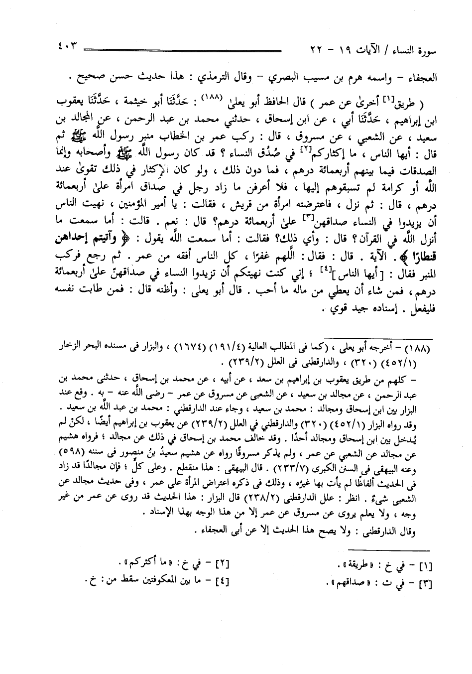 " طَرِيق أُخْرَى عَنْ عُمَر " قَالَ الْحَافِظ أَبُو يَعْلَى : حَدَّثَنَا أَبُو خَيْثَمَة حَدَّثَنَا يَعْقُوب بْن إِبْرَاهِيم حَدَّثَنَا أَبِي عَنْ اِبْن إِسْحَاق حَدَّثَنِي مُحَمَّد بْن عَبْد الرَّحْمَن عَنْ خَالِد بْن سَعِيد عَنْ الشَّعْبِيّ عَنْ مَسْرُوق قَالَ : رَكِبَ عُمَر بْن الْخَطَّاب مِنْبَر رَسُول اللَّه صَلَّى اللَّه عَلَيْهِ وَسَلَّمَ ثُمَّ قَالَ : أَيّهَا النَّاس مَا إِكْثَاركُمْ فِي صَدَاق النِّسَاء وَقَدْ كَانَ رَسُول اللَّه صَلَّى اللَّه عَلَيْهِ وَسَلَّمَ وَأَصْحَابه وَالصَّدُقَات فِيمَا بَيْنهمْ أَرْبَعمِائَةِ دِرْهَم فَمَا دُون ذَلِكَ وَلَوْ كَانَ الْإِكْثَار فِي ذَلِكَ تَقْوَى عِنْد اللَّه أَوْ كَرَامَة لَمْ تَسْبِقُوهُمْ إِلَيْهَا فَلَأَعْرِفَن مَا زَادَ رَجُل فِي صَدَاق اِمْرَأَة عَلَى أَرْبَعمِائَةِ دِرْهَم قَالَ : ثُمَّ نَزَلَ فَاعْتَرَضَتْهُ اِمْرَأَة مِنْ قُرَيْش فَقَالَتْ : يَا أَمِير الْمُؤْمِنِينَ نَهَيْت النَّاس أَنْ يَزِيدُوا فِي مَهْر النِّسَاء عَلَى أَرْبَعمِائَةِ دِرْهَم ؟ قَالَ : نَعَمْ فَقَالَتْ : أَمَا سَمِعْت مَا أَنْزَلَ اللَّه فِي الْقُرْآن ؟ قَالَ : وَأَيّ ذَلِكَ ؟ فَقَالَتْ : أَمَا سَمِعْت اللَّه يَقُول " وَآتَيْتُمْ إِحْدَاهُنَّ قِنْطَارًا " الْآيَة قَالَ : فَقَالَ اللَّهُمَّ غَفْرًا كُلّ النَّاس أَفْقَه مِنْ عُمَر ثُمَّ رَجَعَ فَرَكِبَ الْمِنْبَر فَقَالَ : أَيّهَا النَّاس إِنِّي كُنْت نَهَيْتُكُمْ أَنْ تَزِيدُوا النِّسَاء فِي صَدُقَاتهنَّ عَلَى أَرْبَعمِائَةِ دِرْهَم فَمَنْ شَاءَ أَنْ يُعْطِي مِنْ مَاله مَا أَحَبَّ قَالَ أَبُو يَعْلَى : وَأَظُنّهُ قَالَ : فَمَنْ طَابَتْ نَفْسه فَلْيَفْعَلْ إِسْنَاده جَيِّد قَوِيّ "