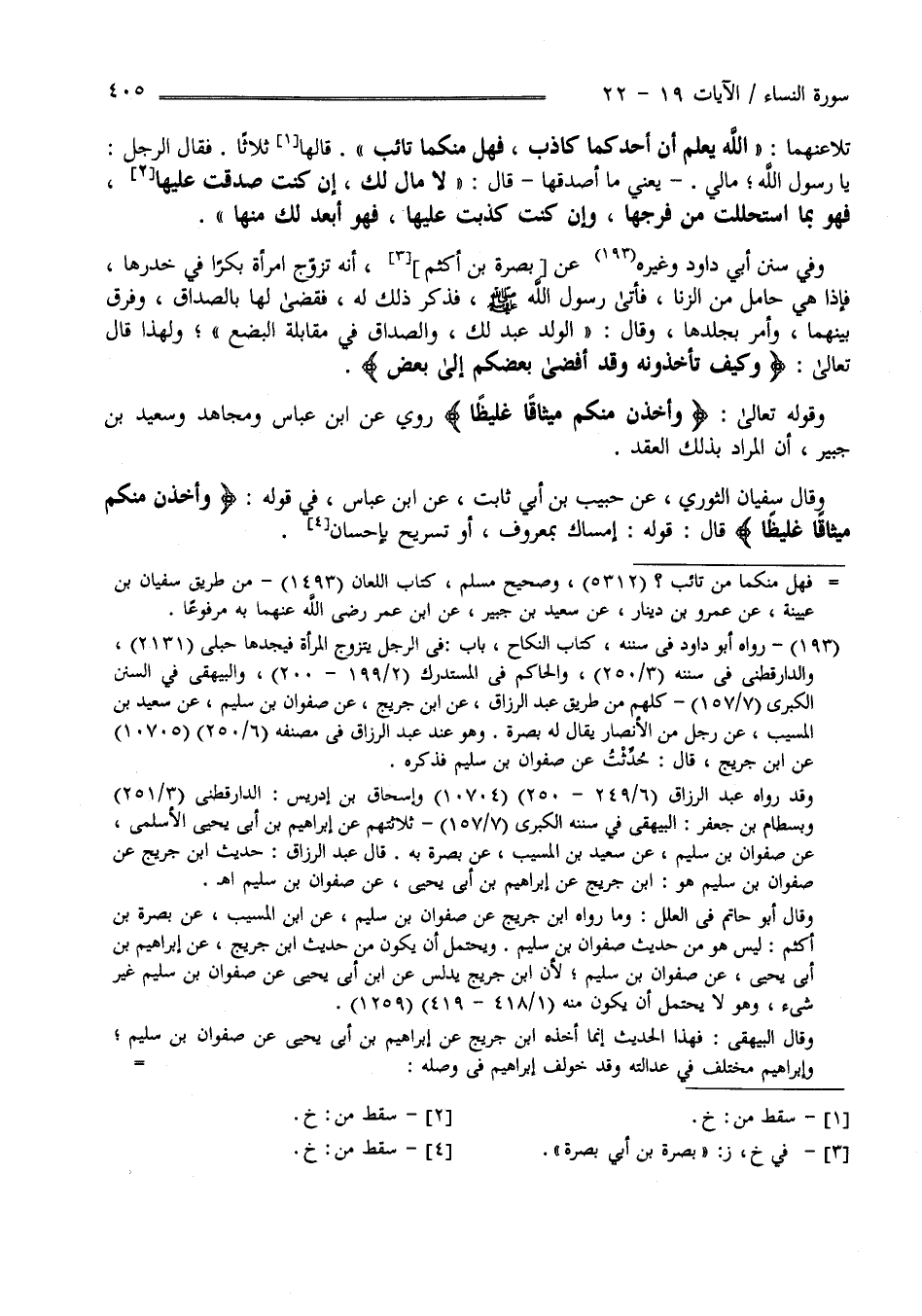 تَلَاعُنهمَا " اللَّه يَعْلَم أَنَّ أَحَدكُمَا كَاذِب فَهَلْ مِنْكُمَا تَائِب " قَالَهَا ثَلَاثًا فَقَالَ الرَّجُل : يَا رَسُول اللَّه مَالِي - يَعْنِي مَا أُصْدِقهَا - قَالَ " لَا مَال لَك إِنْ كُنْت صَدَقْت فَهُوَ بِمَا اِسْتَحْلَلْت مِنْ فَرْجهَا وَإِنْ كُنْت كَذَبْت عَلَيْهَا فَهُوَ أَبْعَد لَك مِنْهَا " وَفِي سُنَن أَبِي دَاوُد وَغَيْره عَنْ نَضْرَة بْن أَبِي نَضْرَة أَنَّهُ تَزَوَّجَ اِمْرَأَة بِكْرًا فِي خِدْرهَا فَإِذَا هِيَ حَامِل مِنْ الزِّنَا فَأَتَى رَسُول اللَّه صَلَّى اللَّه عَلَيْهِ وَسَلَّمَ فَذَكَرَ ذَلِكَ لَهُ فَقَضَى لَهَا بِالصَّدَاقِ وَفَرَّقَ بَيْنهمَا وَأَمَرَ بِجَلْدِهَا وَقَالَ " الْوَلَد عَبْد لَك وَالصَّدَاق فِي مُقَابَلَة الْبُضْع " .
