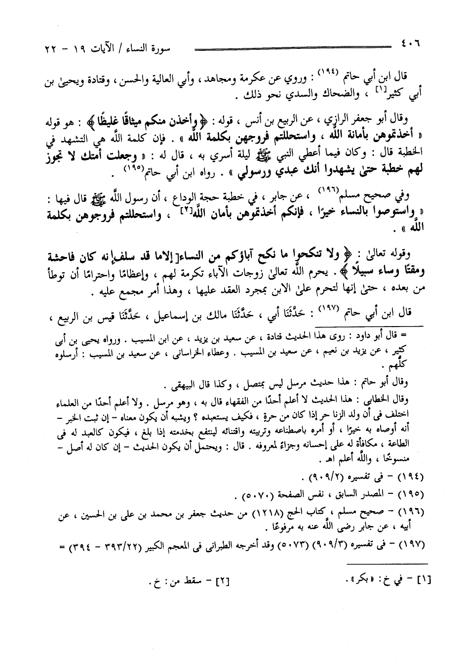 وَقَوْله تَعَالَى " وَلَا تَنْكِحُوا مَا نَكَحَ آبَاؤُكُمْ مِنْ النِّسَاء " الْآيَة يُحَرِّم اللَّه تَعَالَى زَوْجَات الْآبَاء تَكْرِمَة لَهُمْ وَإِعْظَامًا وَاحْتِرَامًا أَنْ تُوطَأ مِنْ بَعْده حَتَّى أَنَّهَا لَتَحْرُم عَلَى الِابْن بِمُجَرَّدِ الْعَقْد عَلَيْهَا وَهَذَا أَمْر مُجْمَع عَلَيْهِ .