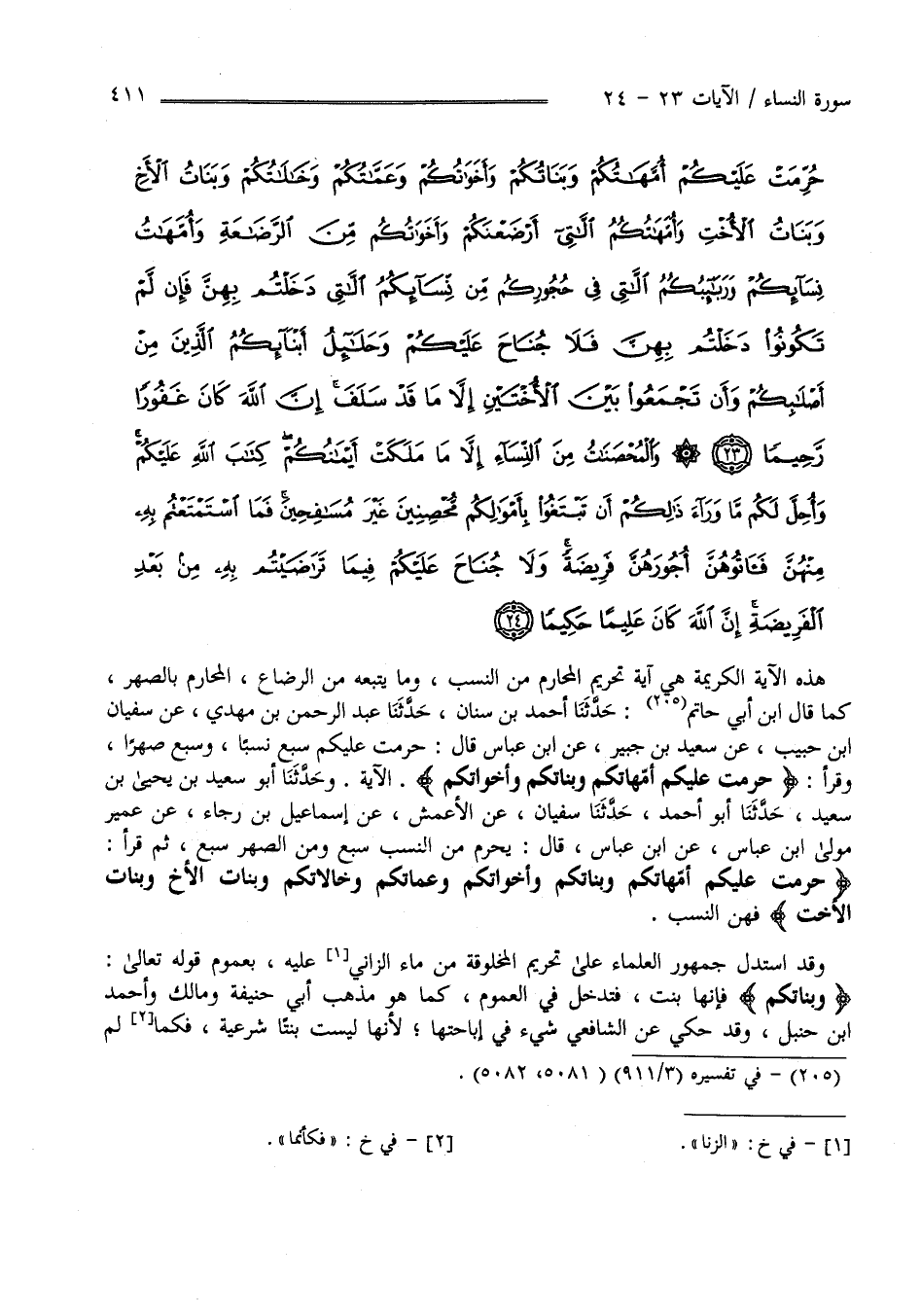 هَذِهِ الْآيَة الْكَرِيمَة هِيَ آيَة تَحْرِيم الْمَحَارِم مِنْ النَّسَب وَمَا يَتْبَعهُ مِنْ الرَّضَاع وَالْمَحَارِم بِالصِّهْرِ كَمَا قَالَ اِبْن أَبِي حَاتِم : حَدَّثَنَا مُحَمَّد بْن سِنَان حَدَّثَنَا عَبْد الرَّحْمَن بْن مَهْدِيّ عَنْ سُفْيَان بْن حَبِيب عَنْ سَعِيد بْن جُبَيْر عَنْ اِبْن عَبَّاس قَالَ : حُرِّمَتْ عَلَيْكُمْ سَبْع نَسَبًا وَسَبْع صِهْرًا وَقَرَأَ " حُرِّمَتْ عَلَيْكُمْ أُمَّهَاتكُمْ وَبَنَاتكُمْ وَأَخَوَاتكُمْ " الْآيَة وَحَدَّثَنَا أَبُو سَعِيد بْن يَحْيَى بْن سَعِيد حَدَّثَنَا أَبُو أَحْمَد حَدَّثَنَا سُفْيَان عَنْ الْأَعْمَش عَنْ إِسْمَاعِيل بْن رَجَاء عَنْ عُمَيْر مَوْلَى اِبْن عَبَّاس عَنْ اِبْن عَبَّاس قَالَ : يَحْرُم مِنْ النَّسَب سَبْع وَمِنْ الصِّهْر سَبْع ثُمَّ قَرَأَ " حُرِّمَتْ عَلَيْكُمْ أُمَّهَاتكُمْ وَبَنَاتكُمْ وَأَخَوَاتكُمْ وَعَمَّاتكُمْ وَخَالَاتكُمْ وَبَنَات الْأَخ وَبَنَات الْأُخْت " فَهُنَّ النَّسَب وَقَدْ اِسْتَدَلَّ جُمْهُور الْعُلَمَاء عَلَى تَحْرِيم الْمَخْلُوقَة مِنْ مَاء الزَّانِي عَلَيْهِ بِعُمُومِ قَوْله تَعَالَى " وَبَنَاتكُمْ " فَإِنَّهَا بِنْت فَتَدْخُل فِي الْعُمُوم كَمَا هُوَ مَذْهَب أَبِي حَنِيفَة وَمَالِك وَأَحْمَد بْن حَنْبَل وَقَدْ حُكِيَ عَنْ الشَّافِعِيّ شَيْء فِي إِبَاحَتهَا لِأَنَّهَا لَيْسَتْ بِنْتًا شَرْعِيَّة فَكَمَا لَمْ