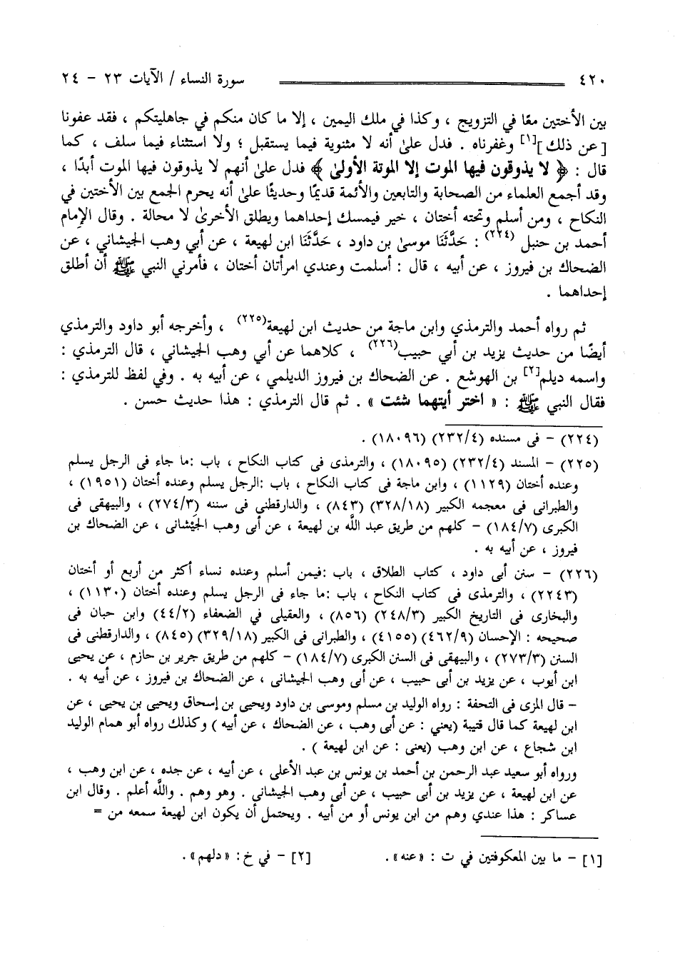 قَالَ الْإِمَام أَحْمَد : حَدَّثَنَا مُوسَى بْن دَاوُد حَدَّثَنَا اِبْن لَهِيعَة عَنْ أَبِي وَهْب الْجَيْشَانِيّ عَنْ الضَّحَّاك بْن فَيْرُوز عَنْ أَبِيهِ قَالَ : أَسْلَمْت وَعِنْدِي اِمْرَأَتَانِ أُخْتَانِ فَأَمَرَنِي النَّبِيّ صَلَّى اللَّه عَلَيْهِ وَسَلَّمَ أَنْ أُطَلِّق إِحْدَاهُمَا .