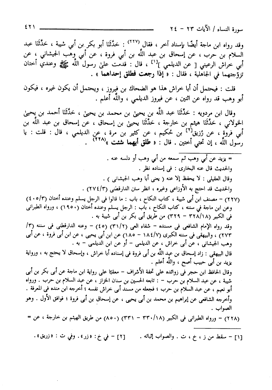 وَقَدْ رَوَاهُ اِبْن مَاجَهْ أَيْضًا بِإِسْنَادٍ آخَر فَقَالَ : حَدَّثَنَا أَبُو بَكْر بْن أَبِي شَيْبَة حَدَّثَنَا عَبْد السَّلَام بْن حَرْب عَنْ إِسْحَاق بْن عَبْد اللَّه بْن أَبِي فَرْوَة عَنْ أَبِي وَهْب الْجَيْشَانِيّ عَنْ أَبِي خِرَاش الرُّعَيْنِيّ قَالَ : قَدِمْت عَلَى رَسُول اللَّه صَلَّى اللَّه عَلَيْهِ وَسَلَّمَ وَعِنْدِي أُخْتَانِ تَزَوَّجْتهمَا فِي الْجَاهِلِيَّة فَقَالَ " إِذَا رَجَعْت فَطَلِّقْ إِحْدَاهُمَا " قُلْت : فَيُحْتَمَل أَنَّ أَبَا خِرَاش هَذَا هُوَ الضَّحَّاك بْن فَيْرُوز وَيُحْتَمَل أَنْ يَكُون غَيْره فَيَكُون أَبُو وَهْب قَدْ رَوَاهُ عَنْ اِثْنَيْنِ عَنْ فَيْرُوز الدَّيْلَمِيّ وَاَللَّه أَعْلَم .