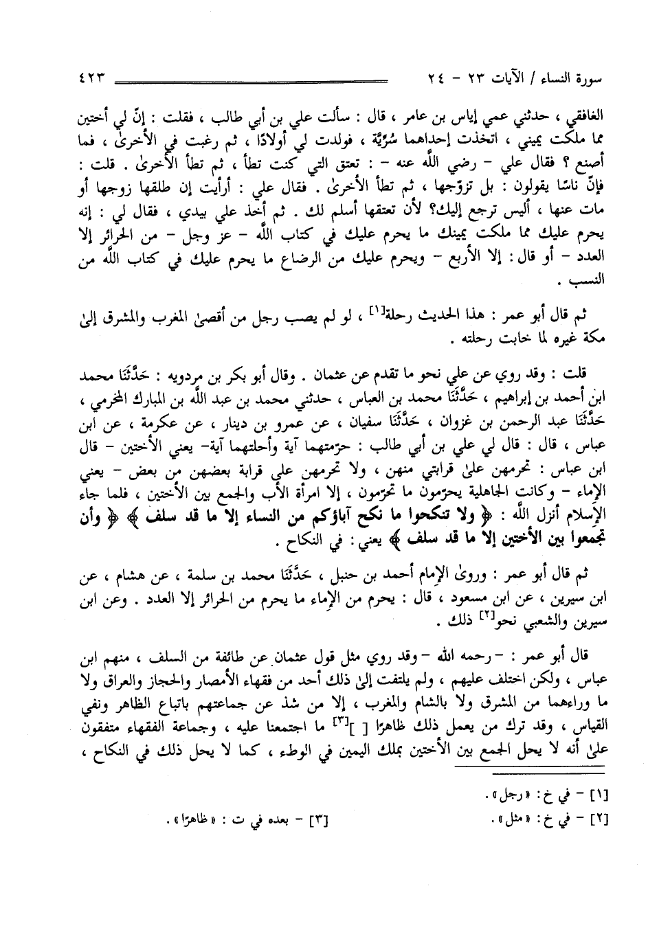 وَقَالَ أَبُو بَكْر بْن مَرْدَوَيْهِ : حَدَّثَنَا مُحَمَّد بْن أَحْمَد بْن إِبْرَاهِيم حَدَّثَنَا مُحَمَّد بْن الْعَبَّاس حَدَّثَنِي مُحَمَّد بْن عَبْد اللَّه بْن الْمُبَارَك الْمُخَرِّمِيّ حَدَّثَنَا عَبْد الرَّحْمَن بْن غَزْوَان حَدَّثَنَا سُفْيَان عَنْ عَمْرو بْن دِينَار عَنْ عِكْرِمَة عَنْ اِبْن عَبَّاس قَالَ : قَالَ عَلِيّ بْن أَبِي طَالِب حَرَّمَتْهُمَا آيَة وَأَحَلَّتْهُمَا آيَة - يَعْنِي الْأُخْتَيْنِ قَالَ اِبْن عَبَّاس : يُحَرِّمْنَ عَلَيَّ قَرَابَتِي مِنْهُنَّ وَلَا يُحَرِّمْنَ قَرَابَة بَعْضهنَّ مِنْ بَعْض يَعْنِي الْإِمَاء وَكَانَتْ الْجَاهِلِيَّة يُحَرِّمُونَ مَا تُحَرِّمُونَ إِلَّا اِمْرَأَة الْأَب وَالْجَمْع بَيْن الْأُخْتَيْنِ فَلَمَّا جَاءَ الْإِسْلَام أَنْزَلَ اللَّه " وَلَا تَنْكِحُوا مَا نَكَحَ آبَاؤُكُمْ مِنْ النِّسَاء إِلَّا مَا قَدْ سَلَف " " وَأَنْ تَجْمَعُوا بَيْن الْأُخْتَيْنِ إِلَّا مَا قَدْ سَلَف " يَعْنِي فِي النِّكَاح ثُمَّ قَالَ اِبْن عُمَر : وَرَوَى الْإِمَام أَحْمَد بْن حَنْبَل حَدَّثَنَا مُحَمَّد بْن سَلَمَة عَنْ هِشَام عَنْ اِبْن سِيرِينَ عَنْ اِبْن مَسْعُود قَالَ : يَحْرُم مِنْ الْإِمَاء مَا يَحْرُم مِنْ الْحَرَائِر إِلَّا الْعَدَد وَعَنْ اِبْن مَسْعُود وَالشَّعْبِيّ نَحْو ذَلِكَ قَالَ أَبُو عَمْرو قَدْ رُوِيَ مِثْل قَوْل عُثْمَان عَنْ طَائِفَة مِنْ السَّلَف مِنْهُمْ اِبْن عَبَّاس وَلَكِنْ اُخْتُلِفَ عَلَيْهِمْ وَلَمْ يَلْتَفِت إِلَى ذَلِكَ أَحَد مِنْ فُقَهَاء الْأَمْصَار وَالْحِجَاز وَالْعِرَاق وَلَا مَا وَرَاءَهُمَا مِنْ الْمَشْرِق وَلَا بِالشَّامِ وَالْمَغْرِب إِلَّا مَنْ شَذَّ عَنْ جَمَاعَتهمْ بِاتِّبَاعِ الظَّاهِر وَنَفْي الْقِيَاس وَقَدْ تَرَكَ مَنْ يَعْمَل ذَلِكَ ظَاهِرًا مَا اِجْتَمَعْنَا عَلَيْهِ وَجَمَاعَة الْفُقَهَاء مُتَّفِقُونَ عَلَى أَنَّهُ لَا يَحِلّ الْجَمْع بَيْن الْأُخْتَيْنِ بِمِلْكِ الْيَمِين فِي الْوَطْء كَمَا لَا يَحِلّ ذَلِكَ فِي النِّكَاح