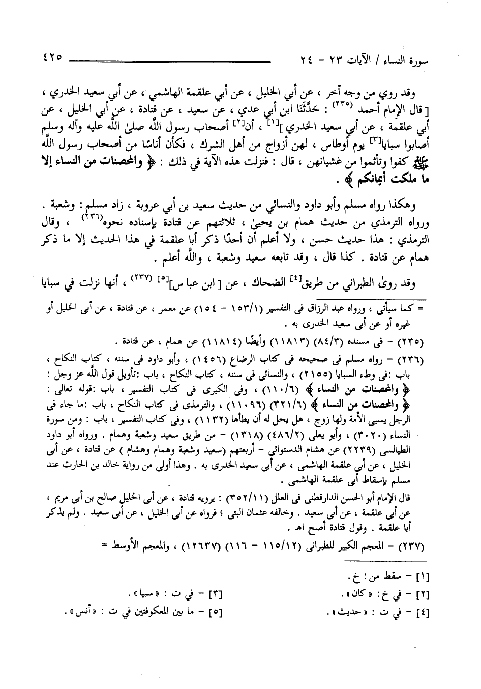 وقد َرُوِيَ مِنْ وَجْه آخَر عَنْ أَبِي الْخَلِيل عَنْ أَبِي عَلْقَمَة الْهَاشِمِيّ عَنْ أَبِي سَعِيد الْخُدْرِيّ قَالَ الْإِمَام أَحْمَد : حَدَّثَنَا اِبْن أَبِي عَدِيّ عَنْ سَعِيد عَنْ قَتَادَة عَنْ أَبِي الْخَلِيل عَنْ أَبِي عَلْقَمَة عَنْ أَبِي سَعِيد الْخُدْرِيّ أَنَّ أَصْحَاب رَسُول اللَّه صَلَّى اللَّه عَلَيْهِ وَآله وَسَلَّمَ أَصَابُوا سَبْيًا يَوْم أَوْطَاس لَهُنَّ أَزْوَاج مِنْ أَهْل الشِّرْك فَكَانَ أُنَاس مِنْ أَصْحَاب رَسُول اللَّه صَلَّى اللَّه عَلَيْهِ وَسَلَّمَ كَفُّوا وَتَأَثَّمُوا مِنْ غَشَيَانهنَّ قَالَ : فَنَزَلَتْ هَذِهِ الْآيَة فِي ذَلِكَ " وَالْمُحْصَنَات مِنْ النِّسَاء إِلَّا مَا مَلَكَتْ أَيْمَانكُمْ " وَهَكَذَا رَوَاهُ مُسْلِم وَأَبُو دَاوُد وَالنَّسَائِيّ مِنْ حَدِيث سَعِيد بْن أَبِي عَرُوبَة زَادَ مُسْلِم وَشُعْبَة وَرَوَاهُ التِّرْمِذِيّ مِنْ حَدِيث هَمَّام بْن يَحْيَى ثَلَاثَتهمْ عَنْ قَتَادَة بِإِسْنَادِهِ نَحْوه وَقَالَ التِّرْمِذِيّ هَذَا حَدِيث حَسَن وَلَا أَعْلَم أَنَّ أَحَدًا ذَكَرَ أَبَا عَلْقَمَة فِي هَذَا الْحَدِيث إِلَّا مَا ذَكَرَ هَمَّام عَنْ قَتَادَة - كَذَا قَالَ وَقَدْ تَابَعَهُ شُعْبَة وَاَللَّه أَعْلَم .