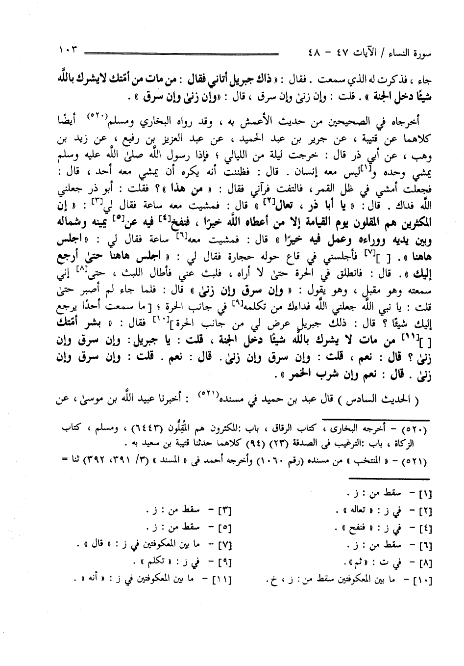جَاءَ فَذَكَرْت لَهُ الَّذِي سَمِعْت فَقَالَ " ذَاكَ جِبْرِيل أَتَانِي فَقَالَ مَنْ مَاتَ مِنْ أُمَّتك لَا يُشْرِك بِاَللَّهِ شَيْئًا دَخَلَ الْجَنَّة " قُلْت وَإِنْ زَنَى وَإِنْ سَرَقَ قَالَ " وَإِنْ زَنَى وَإِنْ سَرَقَ " أَخْرَجَاهُ فِي الصَّحِيحَيْنِ مِنْ حَدِيث الْأَعْمَش بِهِ وَقَدْ رَوَاهُ الْبُخَارِيّ وَمُسْلِم أَيْضًا كِلَاهُمَا عَنْ قُتَيْبَة عَنْ جَرِير بْن عَبْد الْحَمِيد عَبْد الْعَزِيز بْن رُفَيْع عَنْ زَيْد بْن وَهْب عَنْ أَبِي ذَرّ قَالَ : خَرَجْت لَيْلَة مِنْ اللَّيَالِي فَإِذَا رَسُول اللَّه صَلَّى اللَّه عَلَيْهِ وَسَلَّمَ يَمْشِي وَحْده وَلَيْسَ مَعَهُ إِنْسَان قَالَ فَظَنَنْت أَنَّهُ يَكْرَه أَنْ يَمْشِي مَعَهُ أَحَد قَالَ : فَجَعَلْت أَمْشِي فِي ظِلّ الْقَمَر فَالْتَفَتَ فَرَآنِي فَقَالَ " مَنْ هَذَا " فَقُلْت أَبُو ذَرّ جَعَلَنِي اللَّه فِدَاك قَالَ " يَا أَبَا ذَرّ تَعَالَ " قَالَ فَمَشَيْت مَعَهُ سَاعَة فَقَالَ لِي " إِنَّ الْمُكْثِرِينَ هُمْ الْمُقِلُّونَ يَوْم الْقِيَامَة إِلَّا مَنْ أَعْطَاهُ اللَّه خَيْرًا فَجَعَلَ يَبُثّهُ عَنْ يَمِينه وَشِمَاله وَبَيْن يَدَيْهِ وَوَرَاءَهُ وَعَمِلَ فِيهِ خَيْرًا " قَالَ : فَمَشَيْت مَعَهُ سَاعَة فَقَالَ لِي " اِجْلِسْ هَهُنَا" فَأَجْلَسَنِي فِي قَاع حَوْله حِجَارَة فَقَالَ لِي " اِجْلِسْ هَهُنَا حَتَّى أَرْجِع إِلَيْك " قَالَ فَانْطَلَقَ فِي الْحَرَّة حَتَّى لَا أَرَاهُ فَلَبِثَ عَنِّي حَتَّى إِذَا طَالَ اللُّبْث ثُمَّ إِنِّي سَمِعْته وَهُوَ مُقْبِل وَهُوَ يَقُول " وَإِنْ زَنَى وَإِنْ سَرَقَ " قَالَ : فَلَمَّا جَاءَ لَمْ أَصْبِر حَتَّى قُلْت يَا نَبِيّ اللَّه جَعَلَنِي اللَّه فِدَاك مَنْ تَكَلَّمَ فِي جَانِب الْحَرَّة فَإِنِّي سَمِعْت أَحَدًا يُرْجِع إِلَيْك ؟ قَالَ : ذَاكَ جِبْرِيل عَرَضَ لِي مِنْ جَانِب الْحَرَّة فَقَالَ " بَشِّرْ أُمَّتك أَنَّهُ مَنْ مَاتَ لَا يُشْرِك بِاَللَّهِ شَيْئًا دَخَلَ الْجَنَّة قُلْت يَا جِبْرِيل وَإِنْ سَرَقَ وَإِنْ زَنَى قَالَ نَعَمْ قُلْت : وَإِنْ سَرَقَ وَإِنْ زَنَى قَالَ نَعَمْ قُلْت وَإِنْ سَرَقَ وَإِنْ زَنَى قَالَ نَعَمْ وَإِنْ شَرِبَ الْخَمْر "