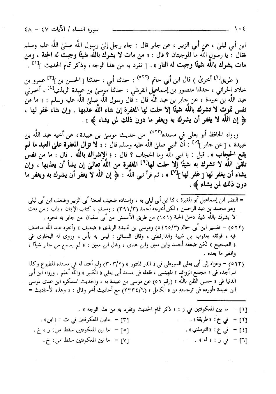 " طَرِيق أُخْرَى " قَالَ اِبْن أَبِي حَاتِم : حَدَّثَنَا أَبِي حَدَّثَنَا الْحَسَن بْن عَمْرو بْن خَلَّاد الْحَرَّانِيّ حَدَّثَنَا مَنْصُور بْن إِسْمَاعِيل الْقُرَشِيّ حَدَّثَنَا مُوسَى بْن عُبَيْدَة التِّرْمِذِيّ أَخْبَرَنِي عَبْد اللَّه بْن عُبَيْدَة عَنْ جَابِر بْن عَبْد اللَّه قَالَ : قَالَ رَسُول اللَّه صَلَّى اللَّه عَلَيْهِ وَسَلَّمَ " مَا مِنْ نَفْس تَمُوت لَا تُشْرِك بِاَللَّهِ شَيْئًا إِلَّا حَلَّتْ لَهَا الْمَغْفِرَة إِنْ شَاءَ اللَّه عَذَّبَهَا وَإِنْ شَاءَ غَفَرَ لَهَا إِنَّ اللَّه لَا يَغْفِر أَنْ يُشْرَك بِهِ وَيَغْفِر مَا دُون ذَلِكَ لِمَنْ يَشَاء وَرَوَاهُ الْحَافِظ أَبُو يَعْلَى فِي مُسْنَده مِنْ حَدِيث مُوسَى بْن عُبَيْدَة عَنْ أَخِيهِ عَبْد اللَّه بْن عُبَيْدَة عَنْ جَابِر أَنَّ النَّبِيّ صَلَّى اللَّه عَلَيْهِ وَسَلَّمَ قَالَ " لَا تَزَال الْمَغْفِرَة عَلَى الْعَبْد مَا لَمْ يَقَع الْحِجَاب " قِيلَ يَا نَبِيّ اللَّه وَمَا الْحِجَاب ؟ قَالَ " الْإِشْرَاك بِاَللَّهِ قَالَ : مَا مِنْ نَفْس تَلْقَى اللَّه لَا تُشْرِك بِهِ شَيْئًا إِلَّا حَلَّتْ لَهَا الْمَغْفِرَة مِنْ اللَّه تَعَالَى إِنْ شَاءَ أَنْ يُعَذِّبهَا وَإِنْ شَاءَ أَنْ يَغْفِر لَهَا " ثُمَّ قَرَأَ نَبِيّ اللَّه إِنَّ اللَّه لَا يَغْفِر أَنْ يُشْرَك بِهِ وَيَغْفِر مَا دُون ذَلِكَ لِمَنْ يَشَاء "