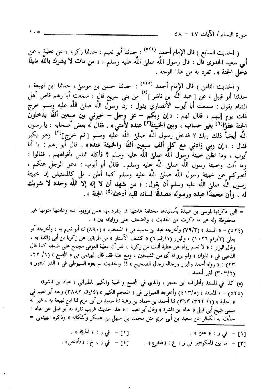 الْحَدِيث السَّابِع " قَالَ الْإِمَام أَحْمَد : حَدَّثَنَا أَبُو نُعَيْم حَدَّثَنَا زَكَرِيَّا عَنْ عَطِيَّة عَنْ أَبِي سَعِيد الْخُدْرِيّ قَالَ : قَالَ رَسُول اللَّه صَلَّى اللَّه عَلَيْهِ وَسَلَّمَ " مَنْ مَاتَ لَا يُشْرِك بِاَللَّهِ شَيْئًا دَخَلَ الْجَنَّة " تَفَرَّدَ بِهِ مِنْ هَذَا الْوَجْه .