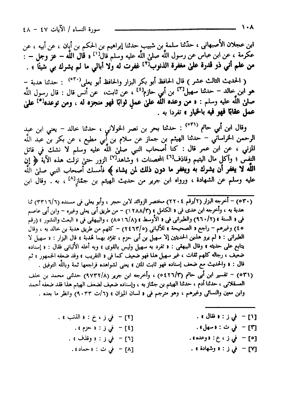 " الْحَدِيث الثَّالِث عَشَر " قَالَ الْحَافِظ أَبُو بَكْر الْبَزَّار وَالْحَافِظ أَبُو يَعْلَى : حَدَّثَنَا هُدْبَة هُوَ اِبْن خَالِد حَدَّثَنَا سَهْل بْن أَبِي حَازِم عَنْ ثَابِت عَنْ أَنَس قَالَ : قَالَ رَسُول اللَّه صَلَّى اللَّه عَلَيْهِ وَسَلَّمَ " مَنْ وَعَدَهُ اللَّه عَلَى عَمَل ثَوَابًا فَهُوَ مُنْجِزه لَهُ وَمَنْ تَوَعَّدَهُ عَلَى عَمَل عِقَابًا فَهُوَ فِيهِ بِالْخِيَارِ " تَفَرَّدَا بِهِ وَقَالَ اِبْن أَبِي حَاتِم : حَدَّثَنَا بَحْر بْن نَصْر الْخَوْلَانِيّ حَدَّثَنَا خَالِد يَعْنِي اِبْن عَبْد الرَّحْمَن الْخُرَاسَانِيّ حَدَّثَنَا الْهَيْثَم بْن حَمَّاد عَنْ سَلَّام بْن أَبِي مُطِيع عَنْ بَكْر بْن عَبْد اللَّه الْمُزَنِيّ عَنْ اِبْن عُمَر قَالَ : كُنَّا أَصْحَاب النَّبِيّ صَلَّى اللَّه عَلَيْهِ وَسَلَّمَ لَا نَشُكّ فِي قَاتِل النَّفْس , وَآكِل مَال الْيَتِيم وَقَاذِف الْمُحْصَنَات , وَشَاهِد الزُّور حَتَّى نَزَلَتْ هَذِهِ الْآيَة إِنَّ اللَّه لَا يَغْفِر أَنْ يُشْرَك بِهِ وَيَغْفِر مَا دُون ذَلِكَ لِمَنْ يَشَاء فَأَمْسَكَ أَصْحَاب النَّبِيّ صَلَّى اللَّه عَلَيْهِ وَسَلَّمَ عَنْ الشَّهَادَة .