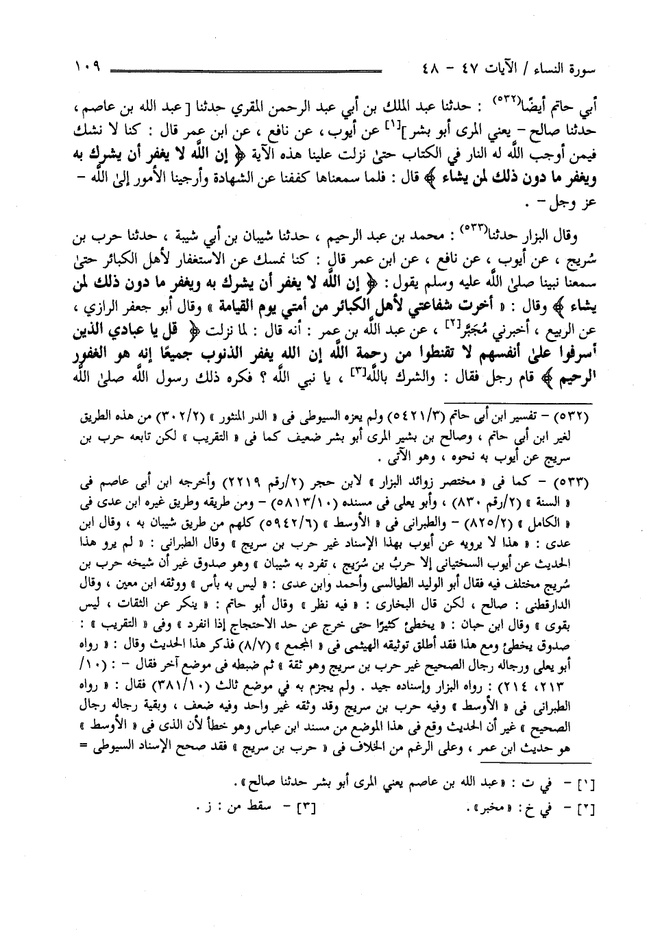 أَبِي حَاتِم أَيْضًا : حَدَّثَنَا عَبْد الْمَلِك بْن أَبِي عُبَيْد الرَّحْمَن الْمُقْرِي حَدَّثَنَا عَبْد اللَّه بْن عَاصِم حَدَّثَنَا صَالِح يَعْنِي الْمُرِّيّ حَدَّثَنَا أَبُو بِشْر عَنْ أَيُّوب عَنْ نَافِع عَنْ اِبْن عُمَر قَالَ : كُنَّا لَا نَشُكّ فِي مَنْ أَوْجَبَ اللَّه لَهُ النَّار فِي الْكِتَاب حَتَّى نَزَلَتْ عَلَيْنَا هَذِهِ الْآيَة إِنَّ اللَّه لَا يَغْفِر أَنْ يُشْرَك بِهِ وَيَغْفِر مَا دُون ذَلِكَ لِمَنْ يَشَاء قَالَ فَلَمَّا سَمِعْنَاهَا كَفَفْنَا عَنْ الشَّهَادَة وَأَرْجَيْنَا الْأُمُور إِلَى اللَّه عَزَّ وَجَلَّ .