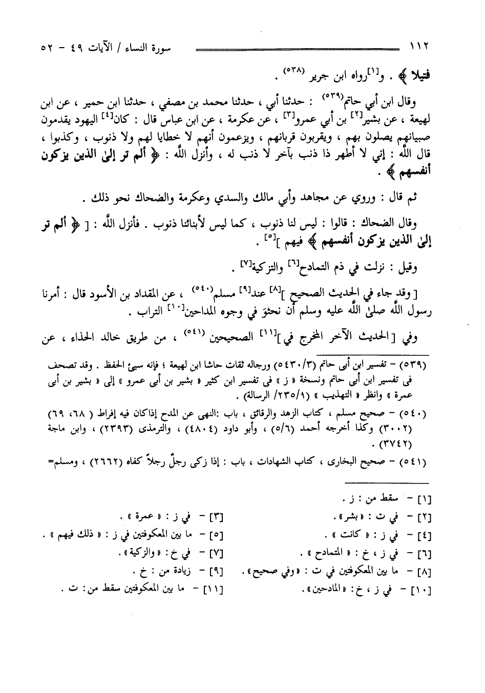 وَكَذَبُوا قَالَ اللَّه إِنِّي لَا أُطَهِّر ذَا ذَنْب بِآخَر لَا ذَنْب لَهُ وَأَنْزَلَ اللَّه أَلَمْ تَرَ إِلَى الَّذِينَ يُزَكُّونَ أَنْفُسهمْ ثُمَّ قَالَ : وَرُوِيَ عَنْ مُجَاهِد وَأَبِي مَالِك وَالسُّدِّيّ وَعِكْرِمَة وَالضَّحَّاك نَحْو ذَلِكَ وَقَالَ الضَّحَّاك : قَالُوا لَيْسَ لَنَا ذُنُوب كَمَا لَيْسَ لِأَبْنَائِنَا ذُنُوب فَأَنْزَلَ اللَّه " أَلَمْ تَرَ إِلَى الَّذِينَ يُزَكُّونَ أَنْفُسهمْ " فِيهِمْ وَقِيلَ نَزَلَتْ فِي ذَمّ التَّمَادُح وَالتَّزْكِيَة وَفِي صَحِيح مُسْلِم عَنْ الْمِقْدَاد بْن الْأَسْوَد قَالَ : أَمَرَنَا رَسُول اللَّه صَلَّى اللَّه عَلَيْهِ وَسَلَّمَ أَنْ نَحْثُو فِي وُجُوه الْمَدَّاحِينَ التُّرَاب .