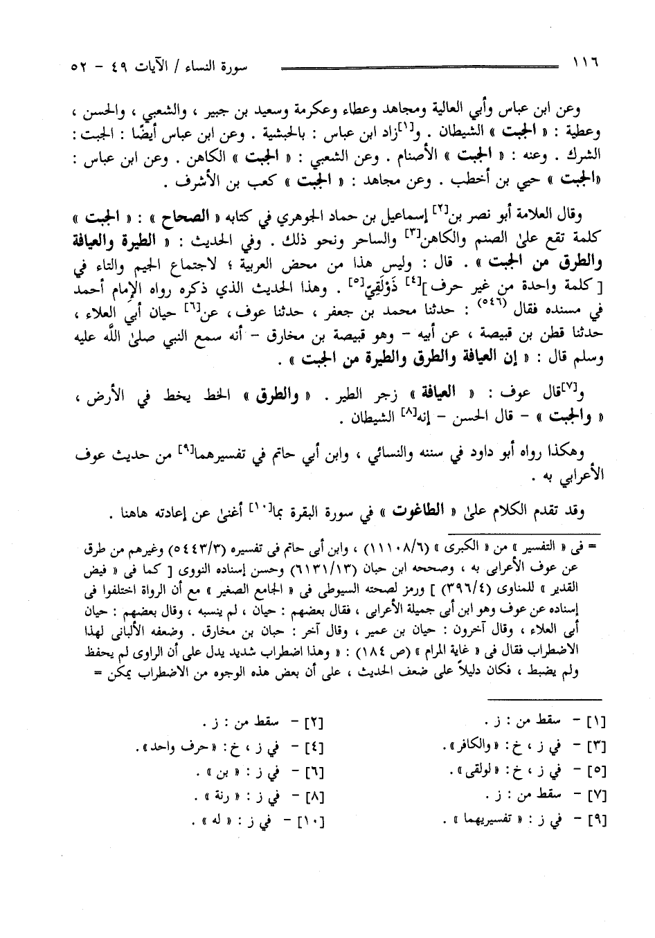وَهَذَا الْحَدِيث الَّذِي ذَكَرَهُ الْإِمَام أَحْمَد فِي مُسْنَده فَقَالَ : حَدَّثَنَا مُحَمَّد بْن جَعْفَر حَدَّثَنَا عَوْف بْن حَيَّان بْن الْعَلَاء حَدَّثَنَا قَطَن بْن قُبَيْصَة عَنْ أَبِيهِ وَهُوَ قُبَيْصَة بْن مُخَارِق أَنَّهُ سَمِعَ النَّبِيّ صَلَّى اللَّه عَلَيْهِ وَسَلَّمَ قَالَ " إِنَّ الْعِيَافَة وَالطَّرْق وَالطِّيَرَة مِنْ الْجِبْت " وَقَالَ عَوْف : الْعِيَافَة زَجْر الطَّيْر وَالطَّرْق الْخَطّ يَخُطّ فِي الْأَرْض وَالْجِبْت قَالَ الْحَسَن رَنَّة الشَّيْطَان وَهَكَذَا رَوَاهُ أَبُو دَاوُد فِي سُنَنه وَالنَّسَائِيّ وَابْن أَبِي حَاتِم فِي تَفْسِيره مِنْ حَدِيث عَوْف الْأَعْرَابِيّ بِهِ .