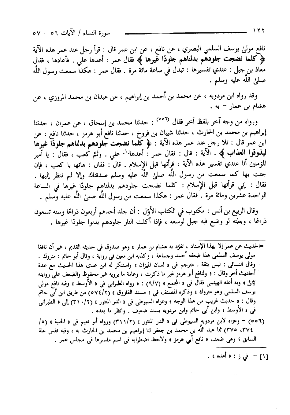 فَقَالَ عُمَر : هَكَذَا سَمِعْت رَسُول اللَّه صَلَّى اللَّه عَلَيْهِ وَسَلَّمَ وَقَدْ رَوَاهُ اِبْن مَرْدَوَيْهِ عَنْ مُحَمَّد بْن أَحْمَد بْن إِبْرَاهِيم عَنْ عَبْدَان بْن مُحَمَّد الْمَرْوَزِيّ عَنْ هِشَام بْن عَمَّار بِهِ وَرَوَاهُ مِنْ وَجْه آخَر بِلَفْظٍ آخَر فَقَالَ : حَدَّثَنَا مُحَمَّد بْن إِسْحَاق عَنْ عِمْرَان حَدَّثَنَا إِبْرَاهِيم بْن مُحَمَّد بْن الْحَارِث حَدَّثَنَا شَيْبَان بْن فَرُّوخ حَدَّثَنَا نَافِع أَبُو هُرْمُز حَدَّثَنَا نَافِع عَنْ اِبْن عُمَر قَالَ : تَلَا رَجُل عِنْد عُمَر هَذِهِ الْآيَة " كُلَّمَا نَضِجَتْ جُلُودهمْ " الْآيَة قَالَ فَقَالَ عُمَر : أَعِدْهَا عَلَيَّ وَثَمَّ كَعْب فَقَالَ : يَا أَمِير الْمُؤْمِنِينَ أَنَا عِنْدِي تَفْسِير هَذِهِ الْآيَة قَرَأْتهَا قَبْل الْإِسْلَام قَالَ فَقَالَ : هَاتِهَا يَا كَعْب فَإِنْ جِئْت بِهَا كَمَا سَمِعْت مِنْ رَسُول اللَّه صَلَّى اللَّه عَلَيْهِ وَسَلَّمَ صَدَّقْنَاك وَإِلَّا لَمْ نَنْظُر إِلَيْهَا فَقَالَ : إِنِّي قَرَأْتهَا قَبْل الْإِسْلَام كُلَّمَا نَضِجَتْ جُلُودهمْ بَدَّلْنَاهُمْ جُلُودًا غَيْرهَا فِي السَّاعَة الْوَاحِدَة عِشْرِينَ وَمِائَة مَرَّة .