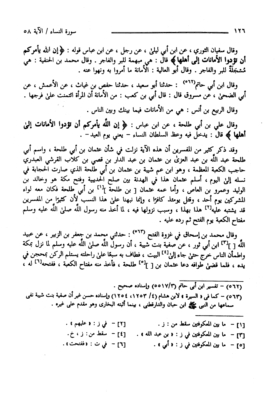 وَقَالَ عَلِيّ بْن أَبِي طَلْحَة عَنْ اِبْن عَبَّاس " إِنَّ اللَّه يَأْمُركُمْ أَنْ تُؤَدُّوا الْأَمَانَات إِلَى أَهْلهَا " قَالَ : قَالَ يَدْخُل فِيهِ وَعْظ السُّلْطَان النِّسَاء " يَعْنِي يَوْم الْعِيد " وَقَدْ ذَكَرَ كَثِير مِنْ الْمُفَسِّرِينَ أَنَّ هَذِهِ الْآيَة نَزَلَتْ فِي شَأْن عُثْمَان بْن طَلْحَة بْن أَبِي طَلْحَة وَاسْم أَبِي طَلْحَة عَبْد اللَّه بْن عَبْد الْعُزَّى بْن عُثْمَان بْن عَبْد الدَّار بْن قُصَيّ بْن كِلَاب الْقُرَشِيّ الْعَبْدَرِيّ حَاجِب الْكَعْبَة الْمُعَظَّمَة وَهُوَ اِبْن عَمّ شَيْبَة بْن عُثْمَان بْن أَبِي طَلْحَة الَّذِي صَارَتْ الْحِجَابَة فِي نَسْله إِلَى الْيَوْم أَسْلَمَ عُثْمَان هَذَا فِي الْهُدْنَة بَيْن صُلْح الْحُدَيْبِيَة وَفَتْح مَكَّة هُوَ وَخَالِد بْن الْوَلِيد وَعَمْرو بْن الْعَاصِ وَأَمَّا عَمّه عُثْمَان بْن طَلْحَة بْن أَبِي طَلْحَة فَكَانَ مَعَهُ لِوَاء الْمُشْرِكِينَ يَوْم أُحُد وَقُتِلَ يَوْمئِذٍ كَافِرًا وَإِنَّمَا نَبَّهْنَا عَلَى هَذَا النَّسَب لِأَنَّ كَثِيرًا مِنْ الْمُفَسِّرِينَ قَدْ يَشْتَبِه عَلَيْهِ هَذَا بِهَذَا وَسَبَب نُزُولهَا فِيهِ لَمَّا أَخَذَ مِنْهُ رَسُول اللَّه صَلَّى اللَّه عَلَيْهِ وَسَلَّمَ مِفْتَاح الْكَعْبَة يَوْم الْفَتْح ثُمَّ رَدَّهُ عَلَيْهِ .