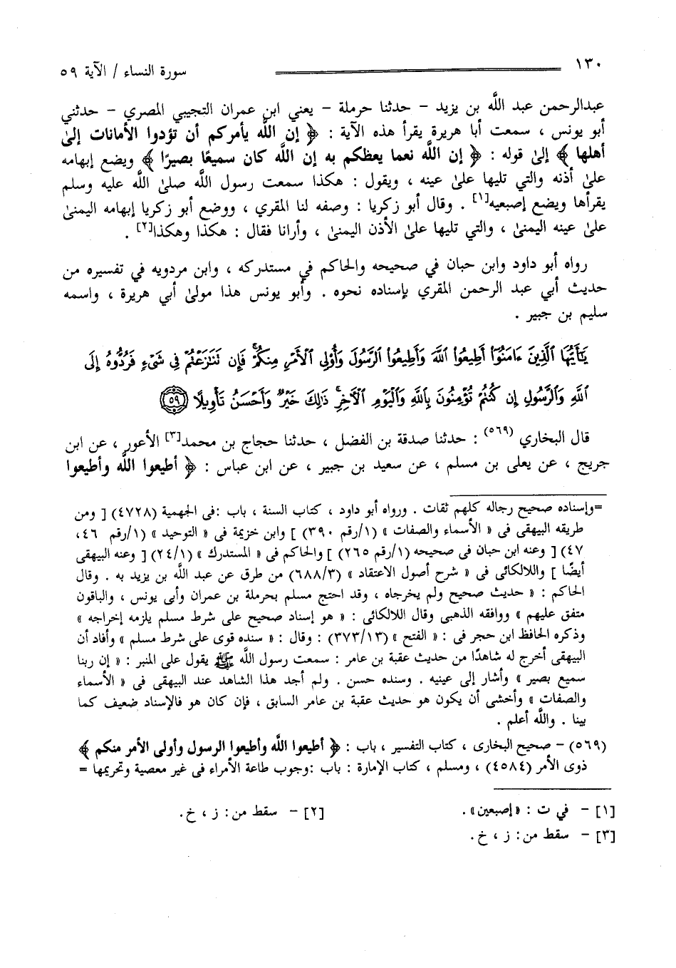 قَالَ الْبُخَارِيّ : حَدَّثَنَا صَدَقَة بْن الْفَضْل حَدَّثَنَا حَجَّاج بْن مُحَمَّد الْأَعْوَر عَنْ اِبْن جُرَيْج عَنْ يَعْلَى بْن مُسْلِم عَنْ سَعِيد بْن جُبَيْر عَنْ اِبْن عَبَّاس " أَطِيعُوا اللَّه وَأَطِيعُوا