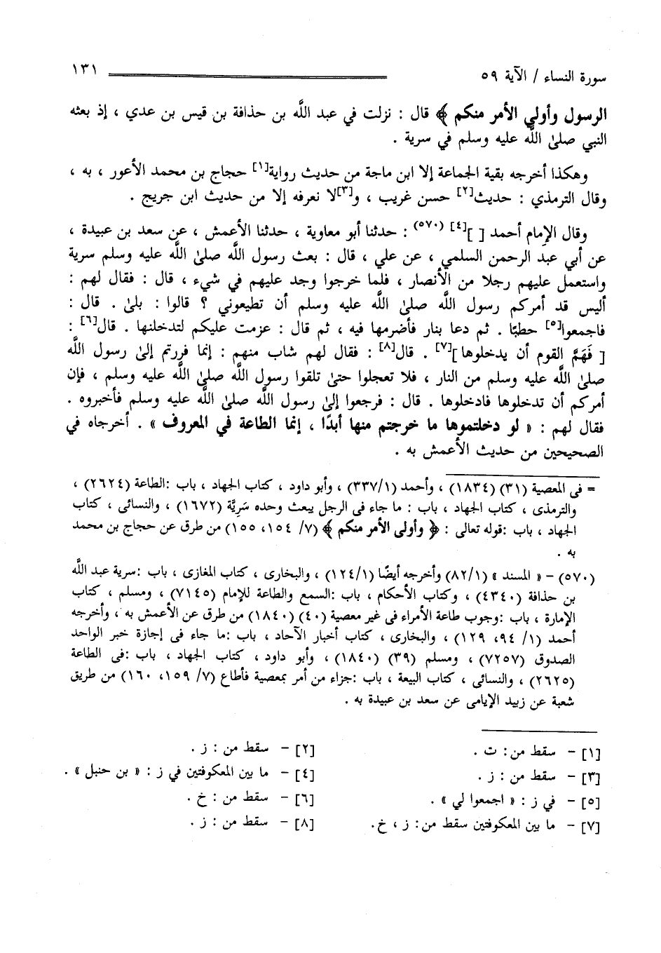 الرَّسُول وَأُولِي الْأَمْر مِنْكُمْ " قَالَ : نَزَلَتْ فِي عَبْد اللَّه بْن حُذَافَة بْن قَيْس بْن عَدِيّ إِذْ بَعَثَهُ رَسُول اللَّه صَلَّى اللَّه عَلَيْهِ وَسَلَّمَ فِي سَرِيَّة وَهَكَذَا أَخْرَجَهُ بَقِيَّة الْجَمَاعَة إِلَّا اِبْن مَاجَهْ مِنْ حَدِيث حَجَّاج بْن مُحَمَّد الْأَعْوَر بِهِ وَقَالَ التِّرْمِذِيّ حَدِيث حَسَن غَرِيب وَلَا نَعْرِفهُ إِلَّا مِنْ حَدِيث اِبْن جُرَيْج وَقَالَ الْإِمَام أَحْمَد : حَدَّثَنَا أَبُو مُعَاوِيَة عَنْ الْأَعْمَش عَنْ سَعْد بْن عُبَيْدَة عَنْ أَبِي عَبْد الرَّحْمَن السُّلَمِيّ عَنْ عَلِيّ قَالَ : بَعَثَ رَسُول اللَّه صَلَّى اللَّه عَلَيْهِ وَسَلَّمَ سَرِيَّة وَاسْتَعْمَلَ عَلَيْهِمْ رَجُلًا مِنْ الْأَنْصَار فَلَمَّا خَرَجُوا وَجَدَ عَلَيْهِمْ فِي شَيْء قَالَ : فَقَالَ لَهُمْ : أَلَيْسَ قَدْ أَمَرَكُمْ رَسُول اللَّه صَلَّى اللَّه عَلَيْهِ وَسَلَّمَ أَنْ تُطِيعُونِي ؟ قَالُوا بَلَى .