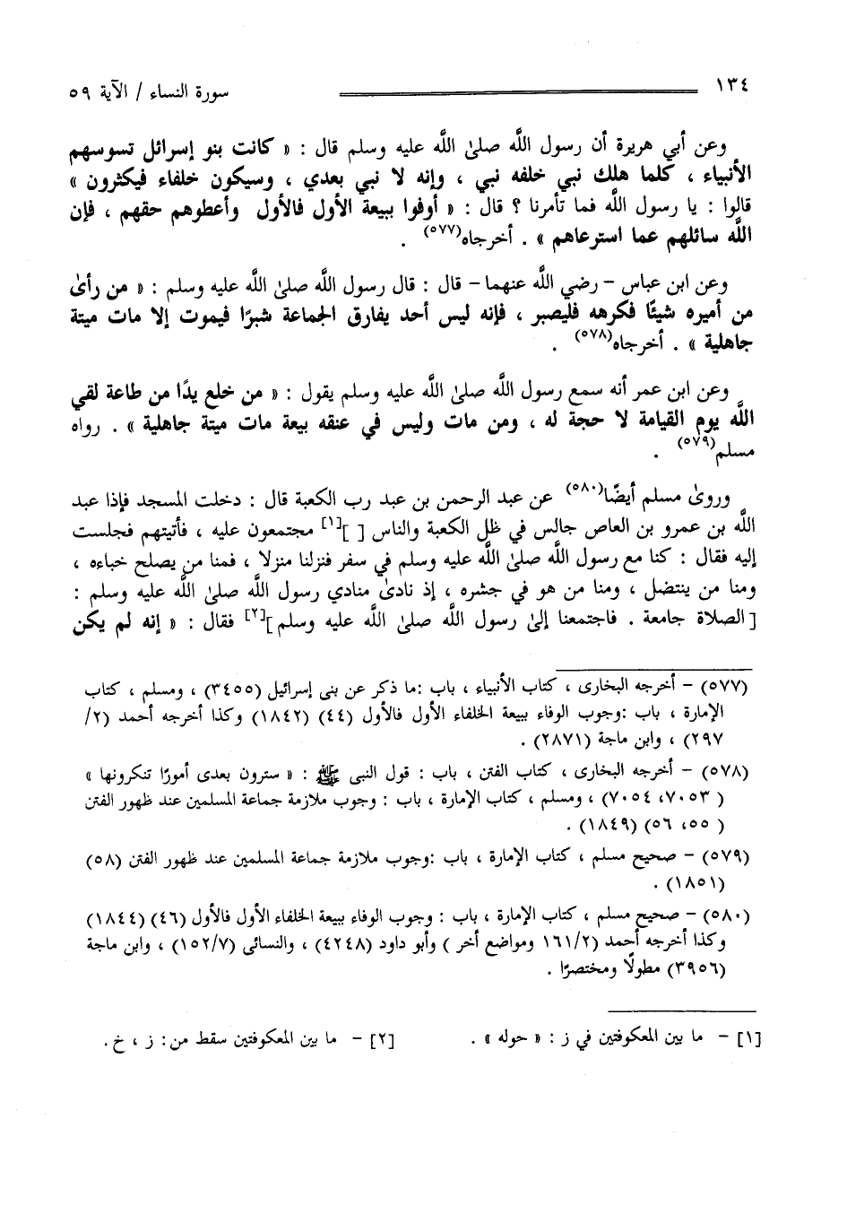 وَعَنْ أَبِي هُرَيْرَة أَنَّ رَسُول اللَّه صَلَّى اللَّه عَلَيْهِ وَسَلَّمَ قَالَ " كَانَتْ بَنُو إِسْرَائِيل تَسُوسهُمْ الْأَنْبِيَاء كُلَّمَا هَلَكَ نَبِيّ خَلَفَهُ نَبِيّ وَإِنَّهُ لَا نَبِيّ بَعْدِي وَسَيَكُونُ خُلَفَاء فَيُكْثِرُونَ قَالُوا : يَا رَسُول اللَّه فَمَا تَأْمُرنَا ؟ قَالَ : " أَوْفُوا بِبَيْعَةِ الْأَوَّل فَالْأَوَّل وَأَعْطُوهُمْ حَقّهمْ فَإِنَّ اللَّه سَائِلهمْ عَمَّا اِسْتَرْعَاهُمْ " أَخْرَجَاهُ.