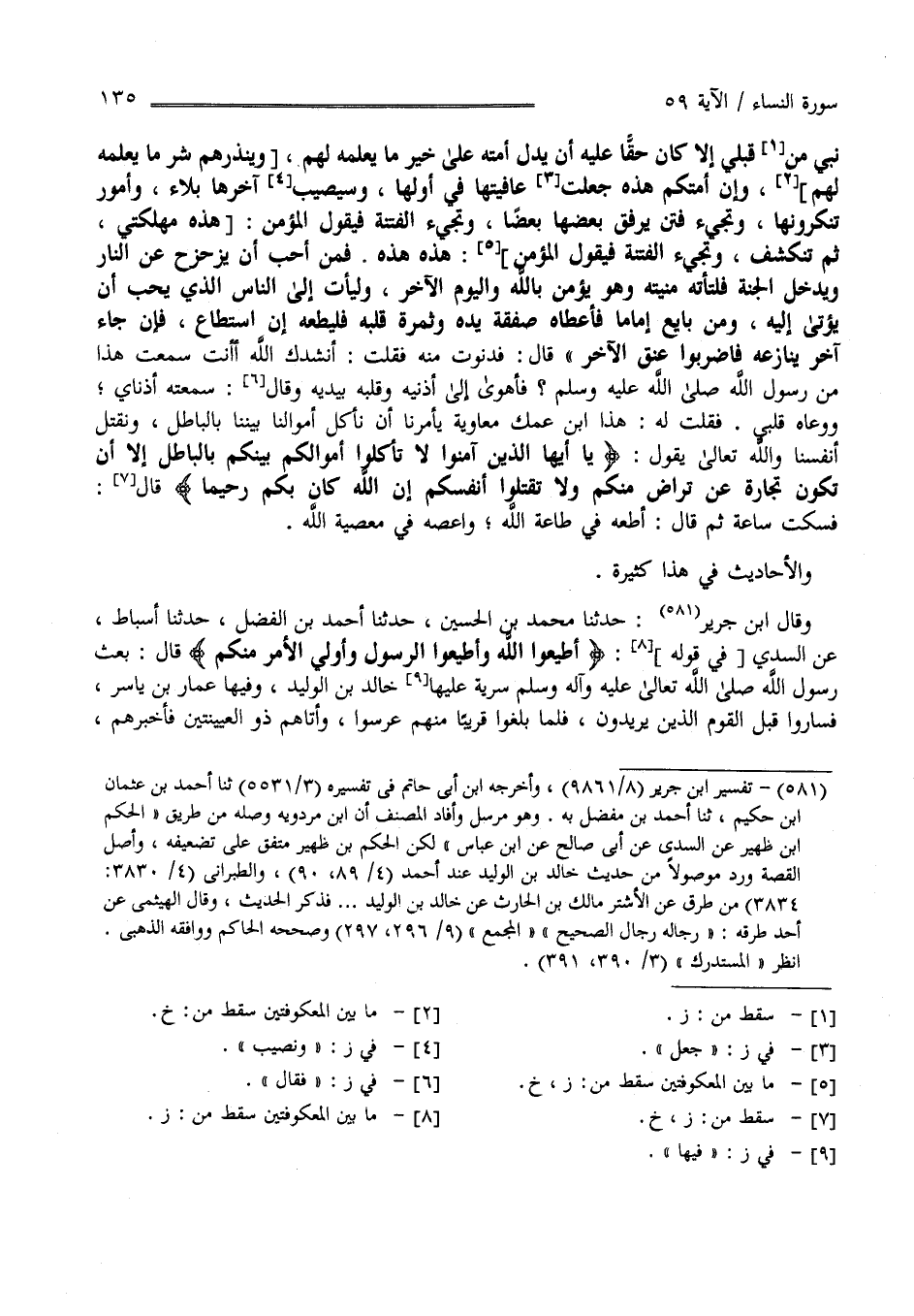 وَقَالَ اِبْن جَرِير : حَدَّثَنَا مُحَمَّد بْن الْحُسَيْن حَدَّثَنَا أَحْمَد بْن الْفَضْل حَدَّثَنَا أَسْبَاط عَنْ السُّدِّيّ فِي قَوْله " أَطِيعُوا اللَّه وَأَطِيعُوا الرَّسُول وَأُولِي الْأَمْر مِنْكُمْ " قَالَ : بَعَثَ رَسُول اللَّه صَلَّى اللَّه تَعَالَى عَلَيْهِ وَآله وَسَلَّمَ سَرِيَّة عَلَيْهَا خَالِد بْن الْوَلِيد وَفِيهَا عَمَّار بْن يَاسِر فَسَارُوا قِبَل الْقَوْم الَّذِينَ يُرِيدُونَ فَلَمَّا بَلَغُوا قَرِيبًا مِنْهُمْ عَرَّسُوا وَأَتَاهُمْ ذُو الْعُيَيْنَتَيْنِ فَأَخْبَرَهُمْ