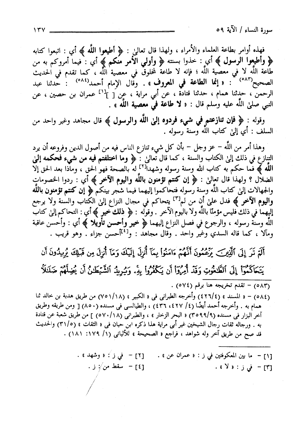 " فَهَذِهِ أَوَامِر بِطَاعَةِ الْعُلَمَاء وَالْأُمَرَاء وَلِهَذَا قَالَ تَعَالَى " أَطِيعُوا اللَّه " أَيْ اِتَّبِعُوا كِتَابه وَأَطِيعُوا الرَّسُول أَيْ خُذُوا بِسُنَّتِهِ وَأُولِي الْأَمْر مِنْكُمْ أَيْ فِيمَا أَمَرُوكُمْ بِهِ مِنْ طَاعَة اللَّه لَا فِي مَعْصِيَة اللَّه فَإِنَّهُ لَا طَاعَة لِمَخْلُوقٍ فِي مَعْصِيَة اللَّه كَمَا تَقَدَّمَ فِي الْحَدِيث الصَّحِيح " إِنَّمَا الطَّاعَة فِي الْمَعْرُوف " وَقَالَ الْإِمَام أَحْمَد حَدَّثَنَا عَبْد الرَّحْمَن حَدَّثَنَا هَمَّام حَدَّثَنَا قَتَادَة عَنْ اِبْن حُرَيْث عَنْ عِمْرَان بْن حُصَيْن عَنْ النَّبِيّ صَلَّى اللَّه عَلَيْهِ وَسَلَّمَ قَالَ " لَا طَاعَة فِي مَعْصِيَة اللَّه " .