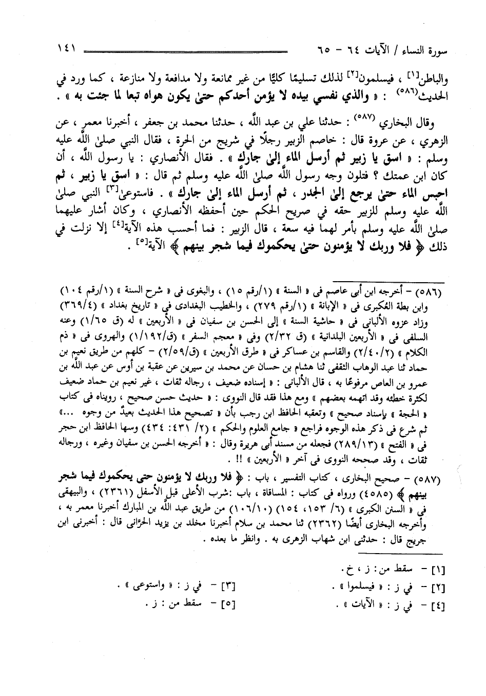 وَالْبَاطِن فَيُسَلِّمُونَ لِذَلِكَ تَسْلِيمًا كُلِّيًّا مِنْ غَيْر مُمَانَعَة وَلَا مُدَافَعَة وَلَا مُنَازَعَة كَمَا وَرَدَ فِي الْحَدِيث " وَاَلَّذِي نَفْسِي بِيَدِهِ لَا يُؤْمِن أَحَدكُمْ حَتَّى يَكُون هَوَاهُ تَبَعًا لِمَا جِئْت بِهِ " وَقَالَ الْبُخَارِيّ : حَدَّثَنَا عَلِيّ بْن عَبْد اللَّه حَدَّثَنَا مُحَمَّد بْن جَعْفَر حَدَّثَنَا مَعْمَر عَنْ الزُّهْرِيّ عَنْ عُرْوَة قَالَ : خَاصَمَ الزُّبَيْر رَجُلًا فِي شِرَاج الْحَرَّة فَقَالَ النَّبِيّ صَلَّى اللَّه عَلَيْهِ وَسَلَّمَ " اِسْقِ يَا زُبَيْر ثُمَّ أَرْسِلْ الْمَاء إِلَى جَارك " فَقَالَ الْأَنْصَارِيّ : يَا رَسُول اللَّه أَنْ كَانَ اِبْن عَمَّتك ؟ فَتَلَوَّنَ وَجْه رَسُول اللَّه صَلَّى اللَّه عَلَيْهِ وَسَلَّمَ ثُمَّ قَالَ " اِسْقِ يَا زُبَيْر ثُمَّ اِحْبِسْ الْمَاء حَتَّى يَرْجِع إِلَى الْجُدُر ثُمَّ أَرْسِلْ الْمَاء إِلَى جَارك " فَاسْتَوْعَى النَّبِيّ صَلَّى اللَّه عَلَيْهِ وَسَلَّمَ وَسَلَّمَ لِلزُّبَيْرِ حَقّه فِي صَرِيح الْحُكْم حِين أَحْفَظهُ الْأَنْصَارِيّ وَكَانَ أَشَارَ عَلَيْهِمَا صَلَّى اللَّه عَلَيْهِ وَسَلَّمَ بِأَمْرٍ لَهُمَا فِيهِ سَعَة قَالَ الزُّبَيْر : فَمَا أَحْسَب هَذِهِ الْآيَة إِلَّا نَزَلَتْ فِي ذَلِكَ " فَلَا وَرَبِّك لَا يُؤْمِنُونَ حَتَّى يُحَكِّمُوك فِيمَا شَجَرَ بَيْنهمْ " الْآيَة .